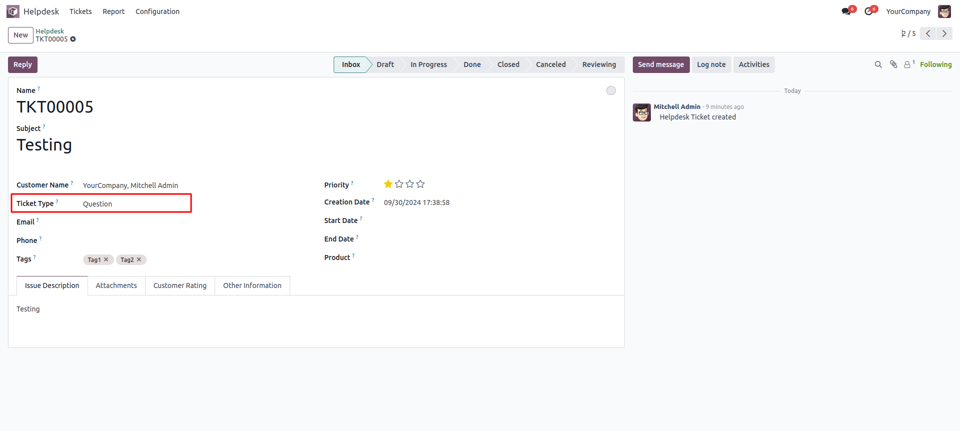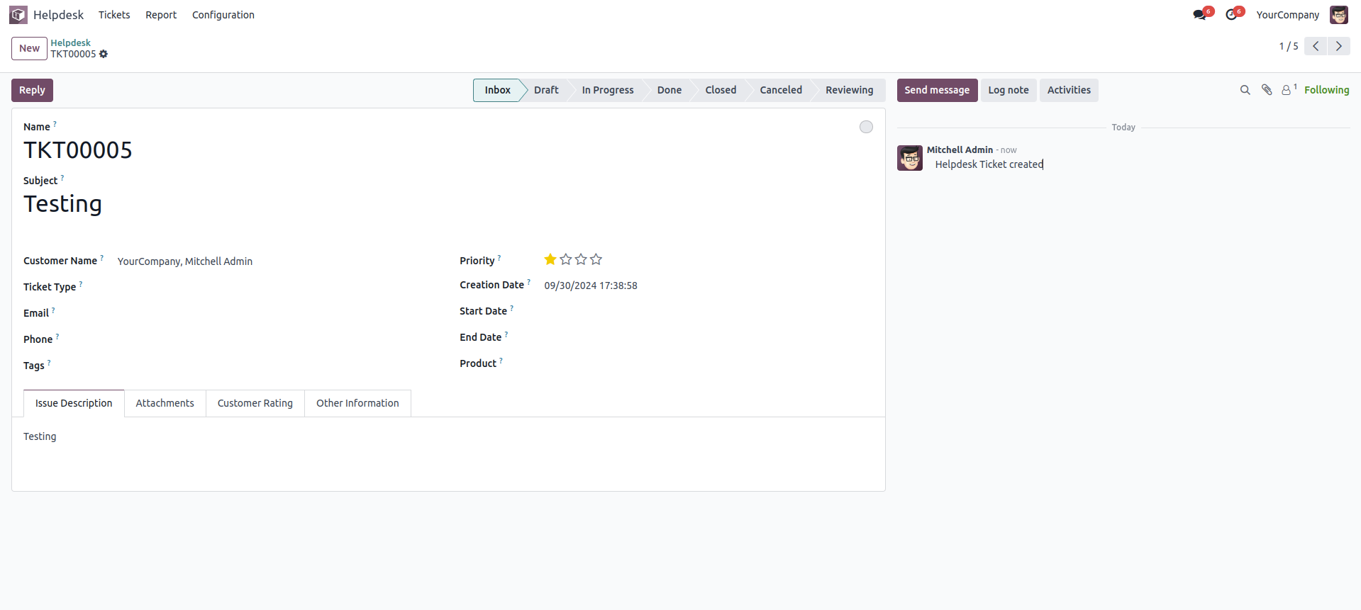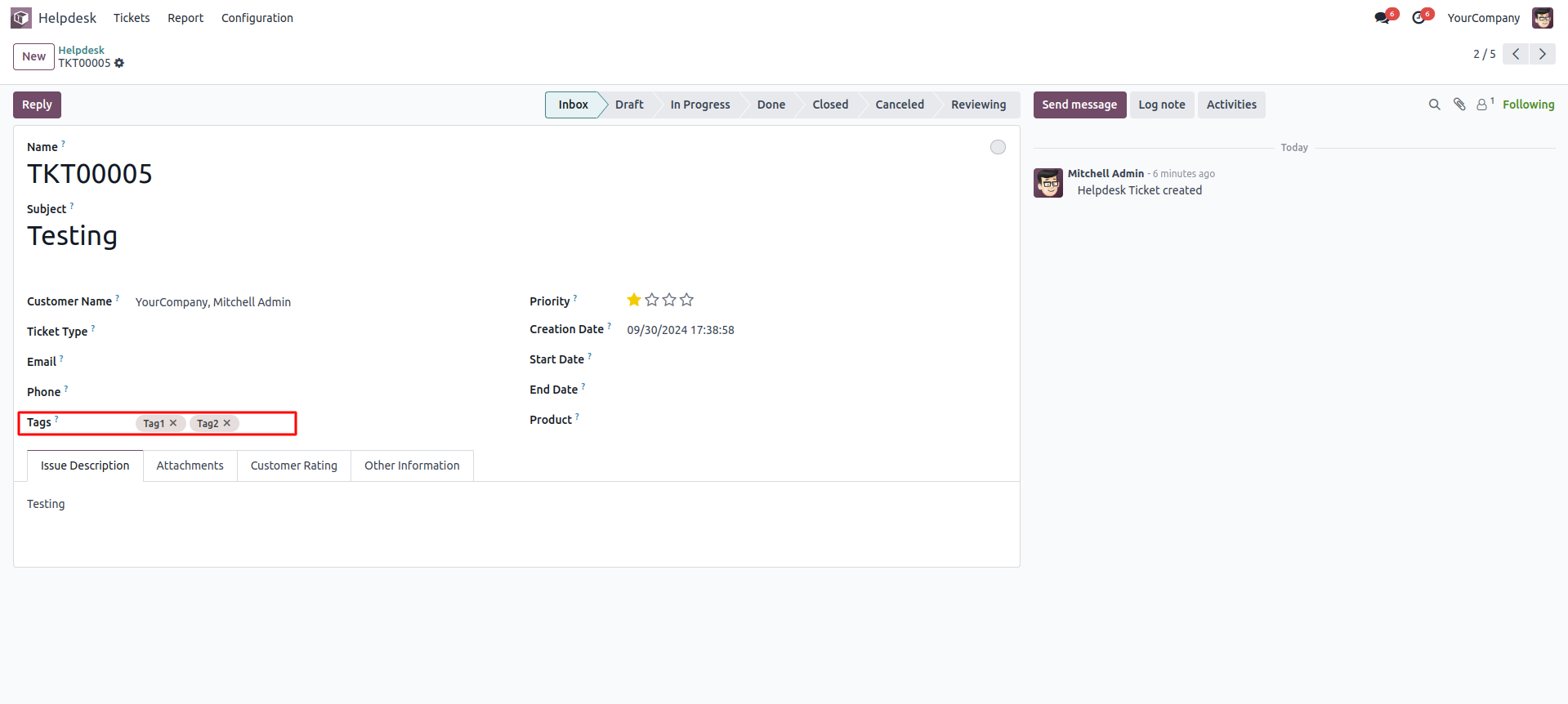 On the Helpdesk Ticket form view, we can see the stages of the tickets based on the settings we configured in the Configuration.