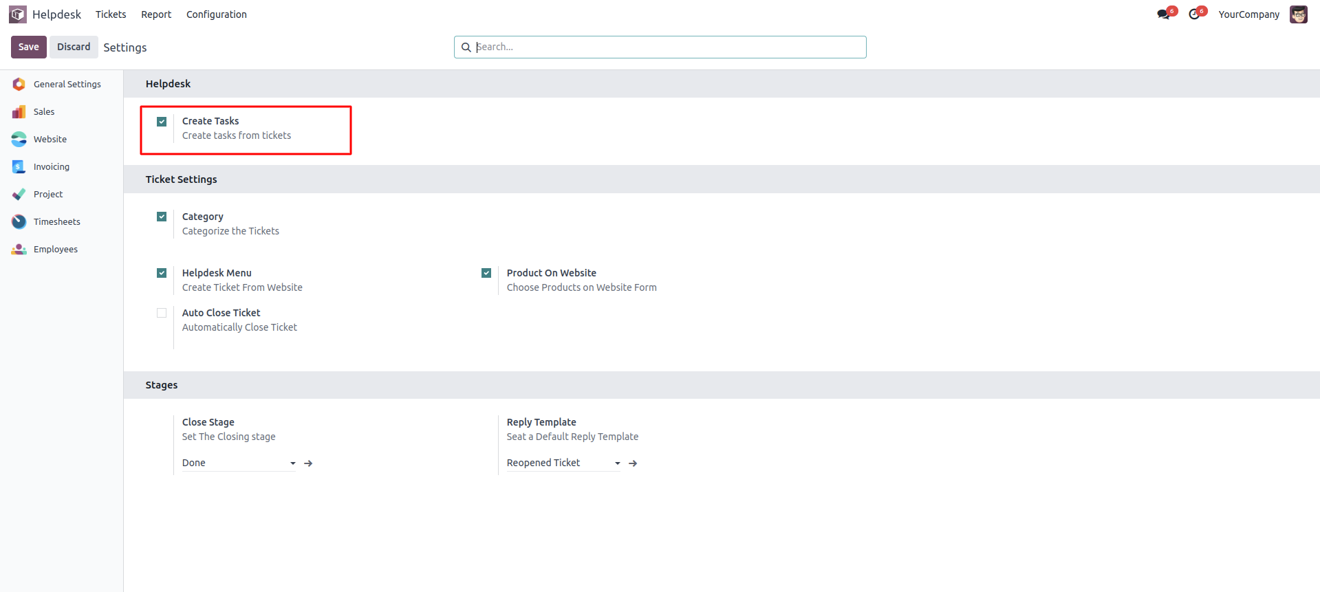 The option "Create Tasks" may be found in the "Configuration > Settings" menu; by enabling it, you can generate tasks from the Helpdesk Ticket.