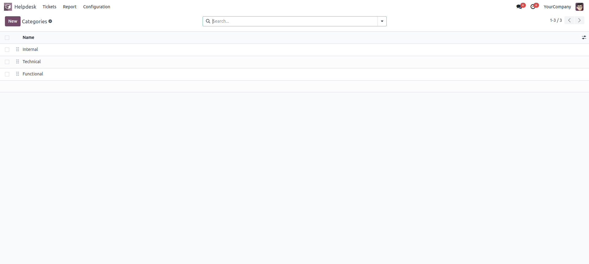 In the "Configuration" menu, you can see "Types" to allocate types to Helpdesk Tickets. Using the "NEW" button you can create new types.