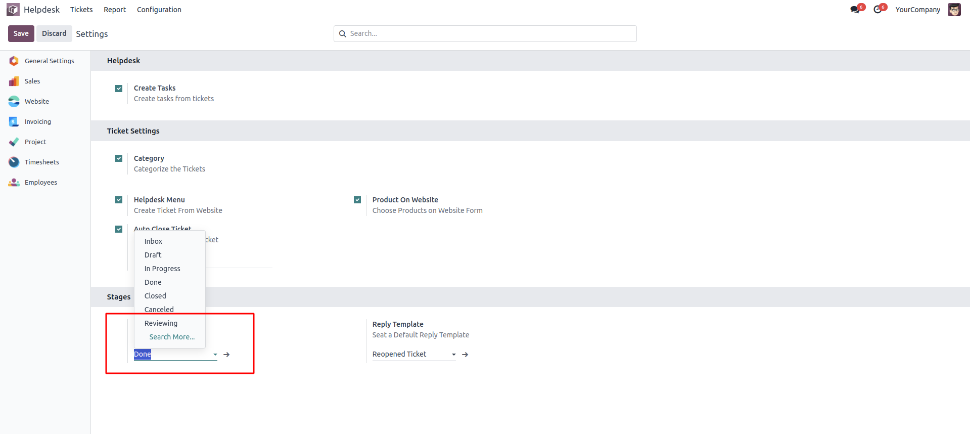 The option "Close Stage" may be found in the "Configuration > Settings" menu; by configuring it, you can select default closing stage for the helpdesk ticket.