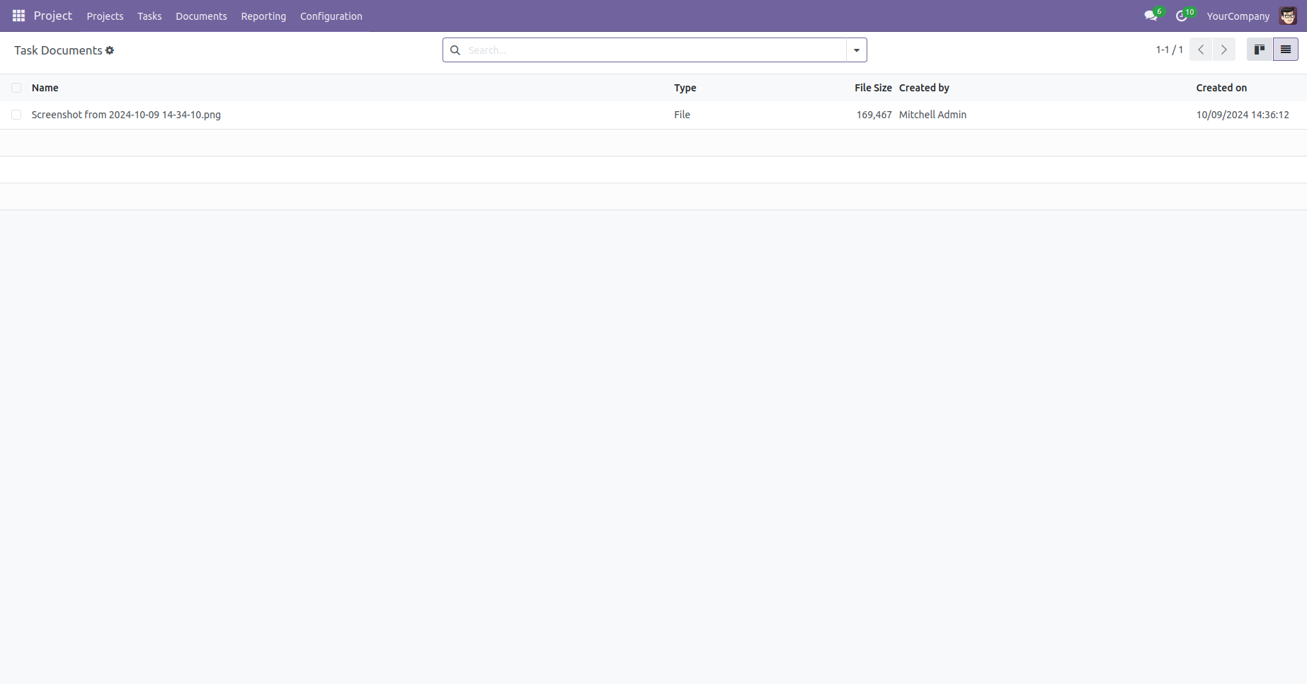 Attached documents are available under a separate menu in the Project module and can also be viewed in the List, Kanban, and Form views.