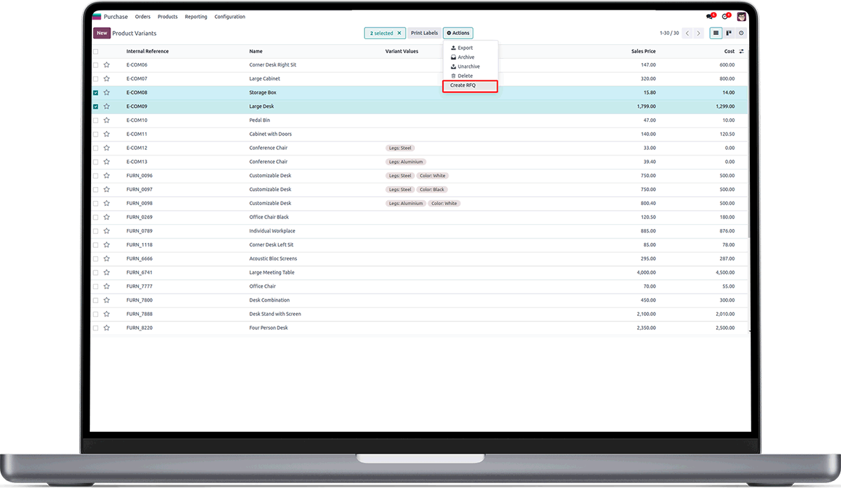Added Create RFQ option inside Action button of Products Variants list.