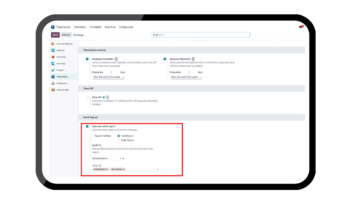 Enable 'Generate work report' from Timesheet -> Configuration -> Settings. Select Report method as Task Report to send the report on task basis. Employees who should receive the work report can be chosen from timesheet settings.