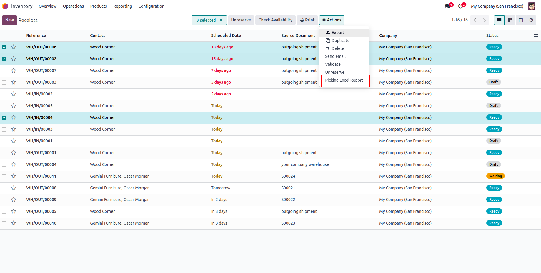 Go to inventory -> select records from the tree view for the transfer -> From the action menu -> Picking Excel Report