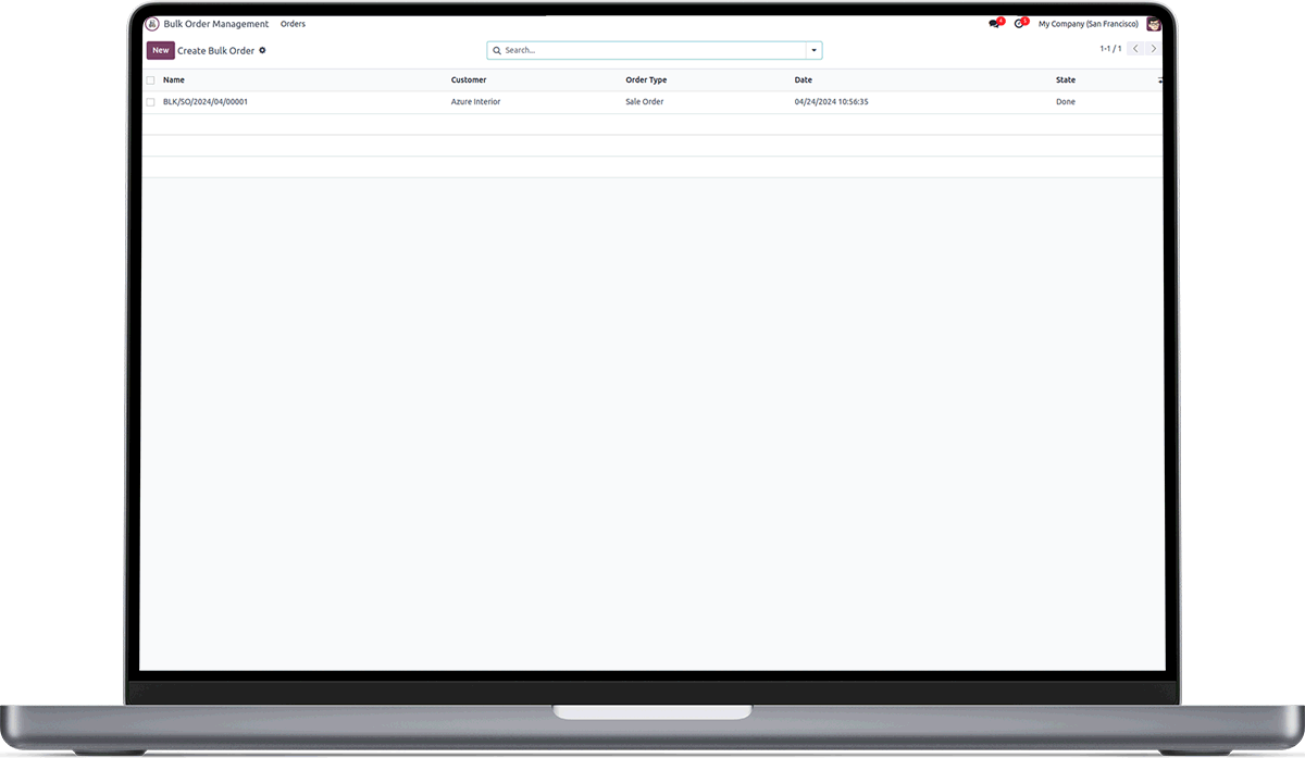 When you click the smart button Sale Orders, you will see the Sale Orders created from the current Bulk Order in tree view.