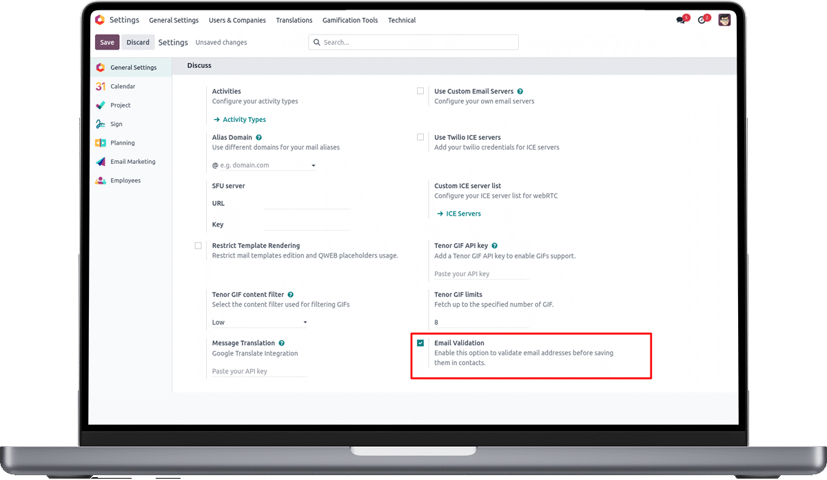 Go to Settings > General Settings and enable the "Email Validation" option. This will enforce email format validation and domain verification before saving a contact.