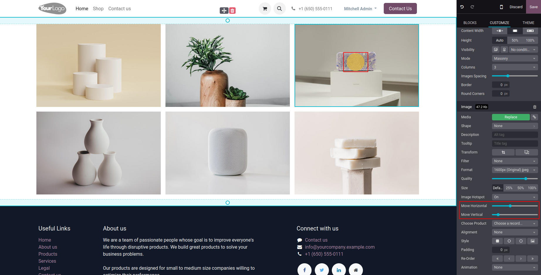 Adjust the horizontal and vertical positioning of image hotspot to place it in desired position using the "Move Horizontal" and "Move Vertical" snippet options.