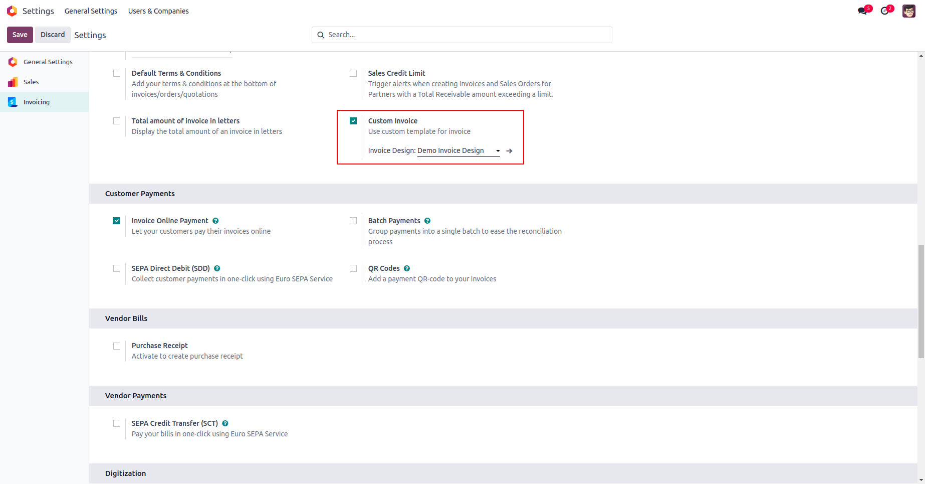 Enable 'Custom Invoice' option in Configuration settings and choose a design. Chosen design will be used to print custom invoice.