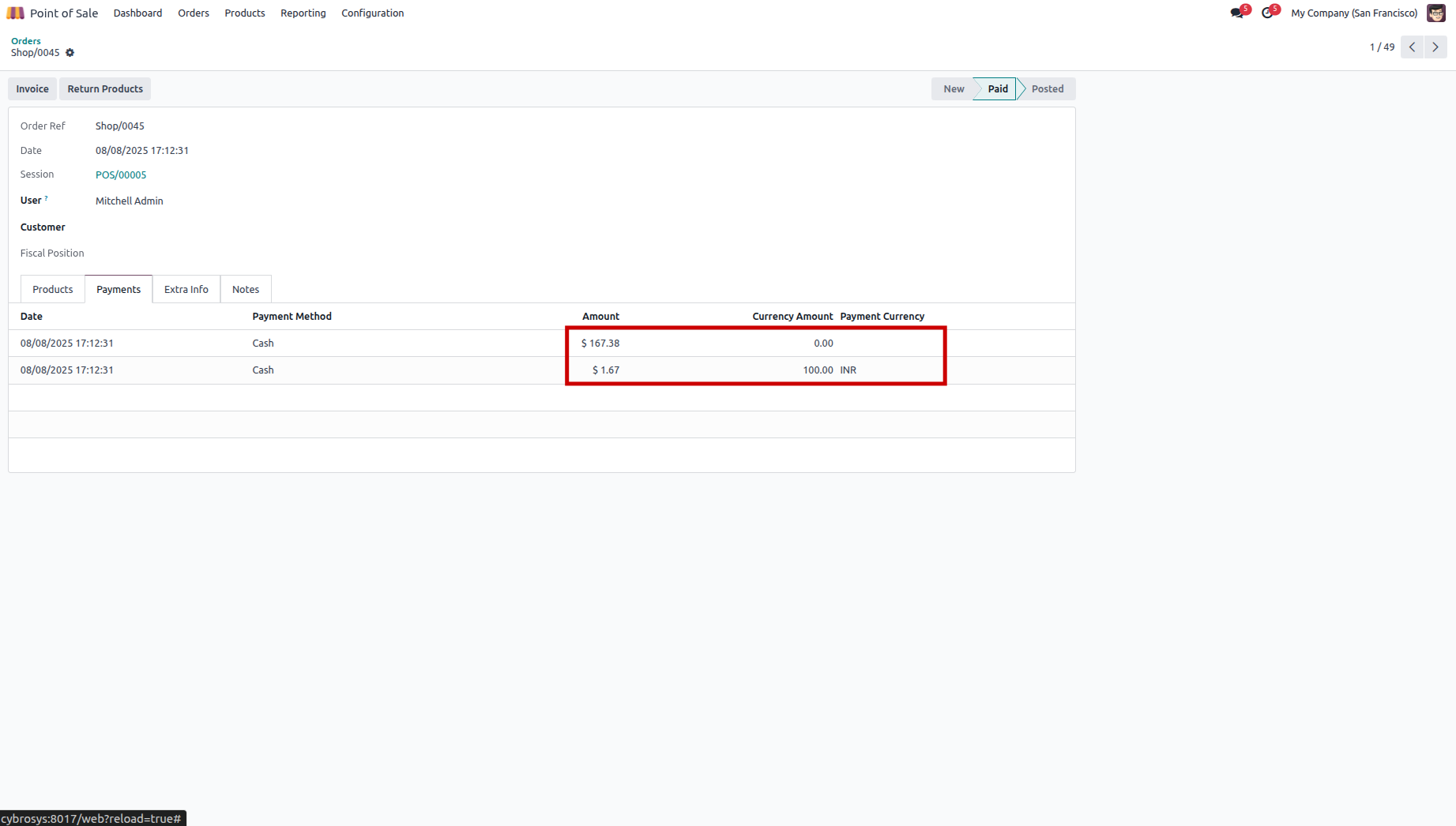 Showcases the payment currency and converted currency amount in the backend POS order.