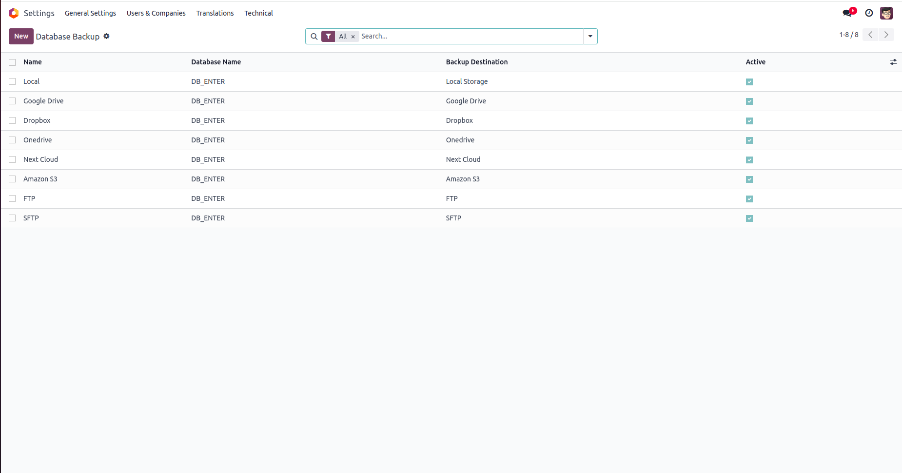 Go to Setting --> Technical --> Backup Configuration to configure backups.
