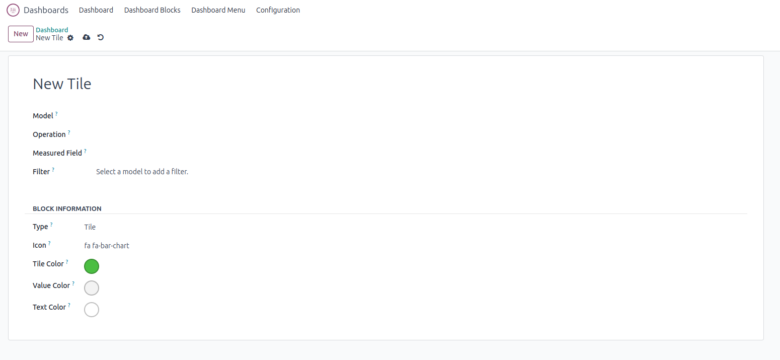 When choosing the "Tile" option, input a name for the tile, select a model, operation type, and measured field. Additionally, customize the tile with an icon and color.