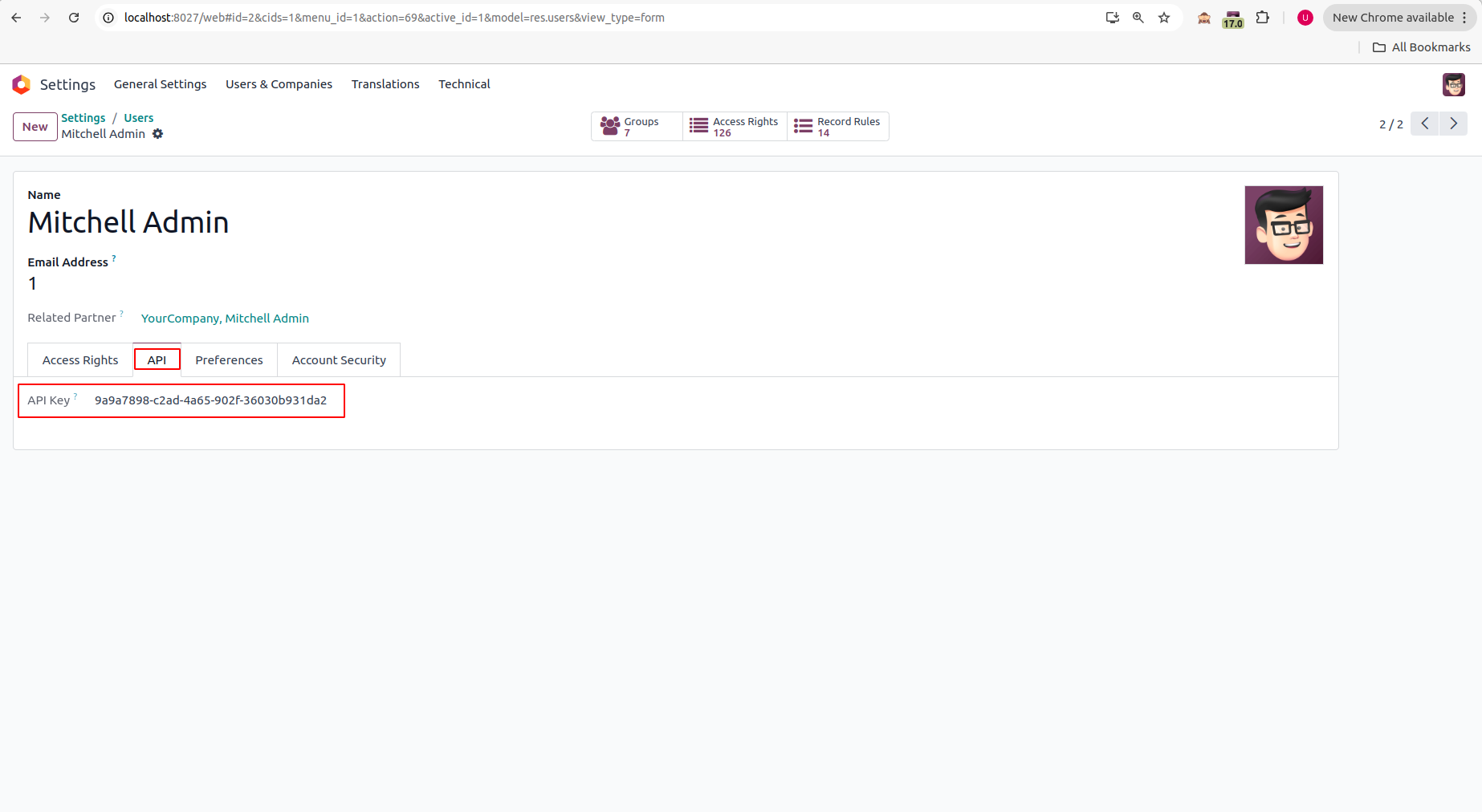 To find the generated API Key for the current user, navigate to Settings > Users & Companies > Users, open the user's form view, and go to the API tab. The API Key will be displayed there.