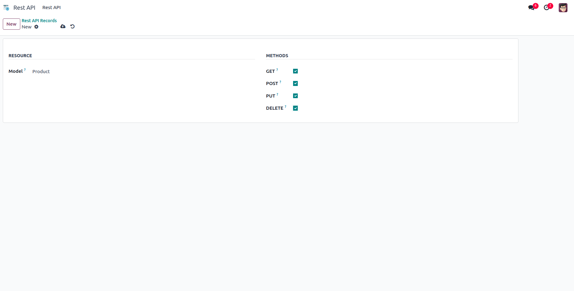 Navigate to Rest API in Rest API module and create new record. Select the model and the HTTP methods. The chosen methods will determine the allowed actions on the records, and the API response will reflect the changes made.