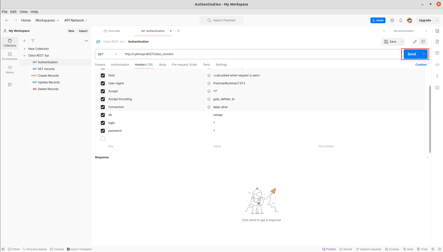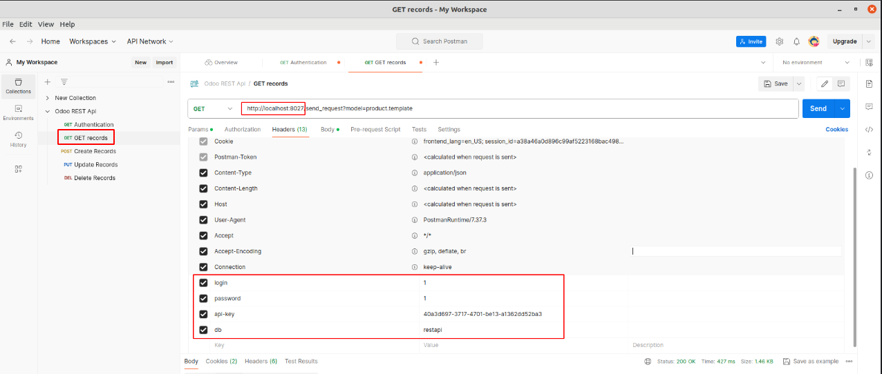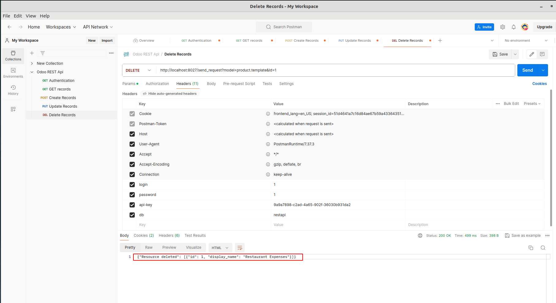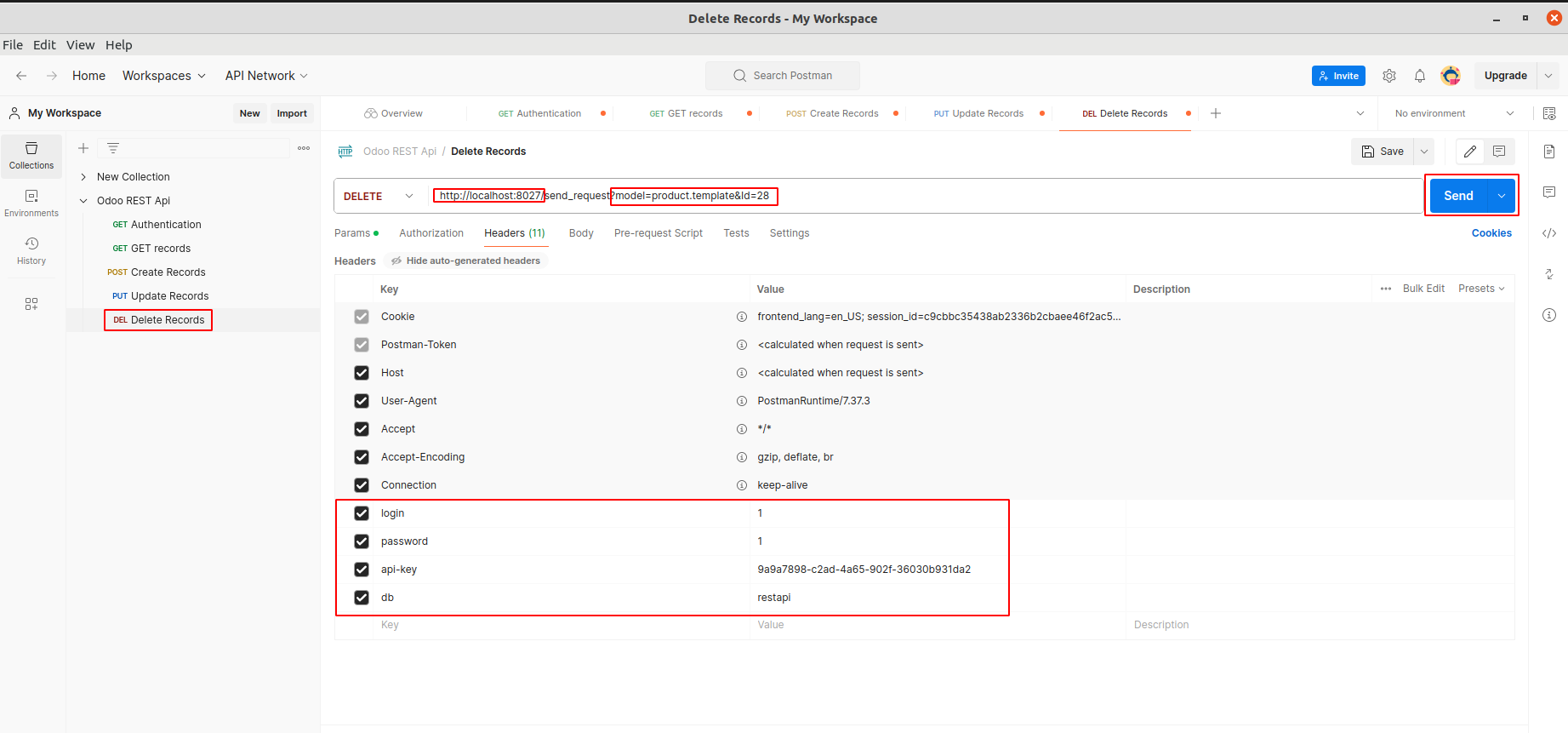Open Delete Records from Rest API Collection. Add db, api-key, login and password under Headers. Update the Base Url. Add the model and the id of the record to delete and click Send. Note: Make sure that DELETE method is enabled for the selected model in Rest API record.
