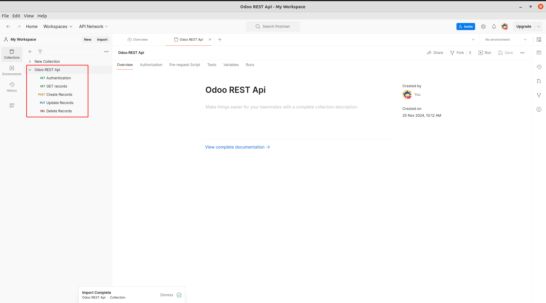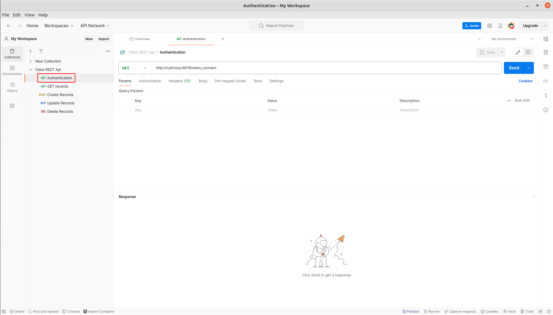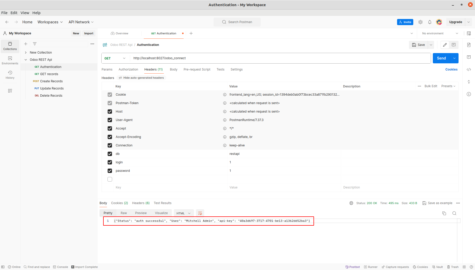 Open Delete Records from Rest API Collection. Add db, api-key, login and password under Headers. Update the Base Url. Add the model and the id of the record to delete and click Send. Note: Make sure that DELETE method is enabled for the selected model in Rest API record.