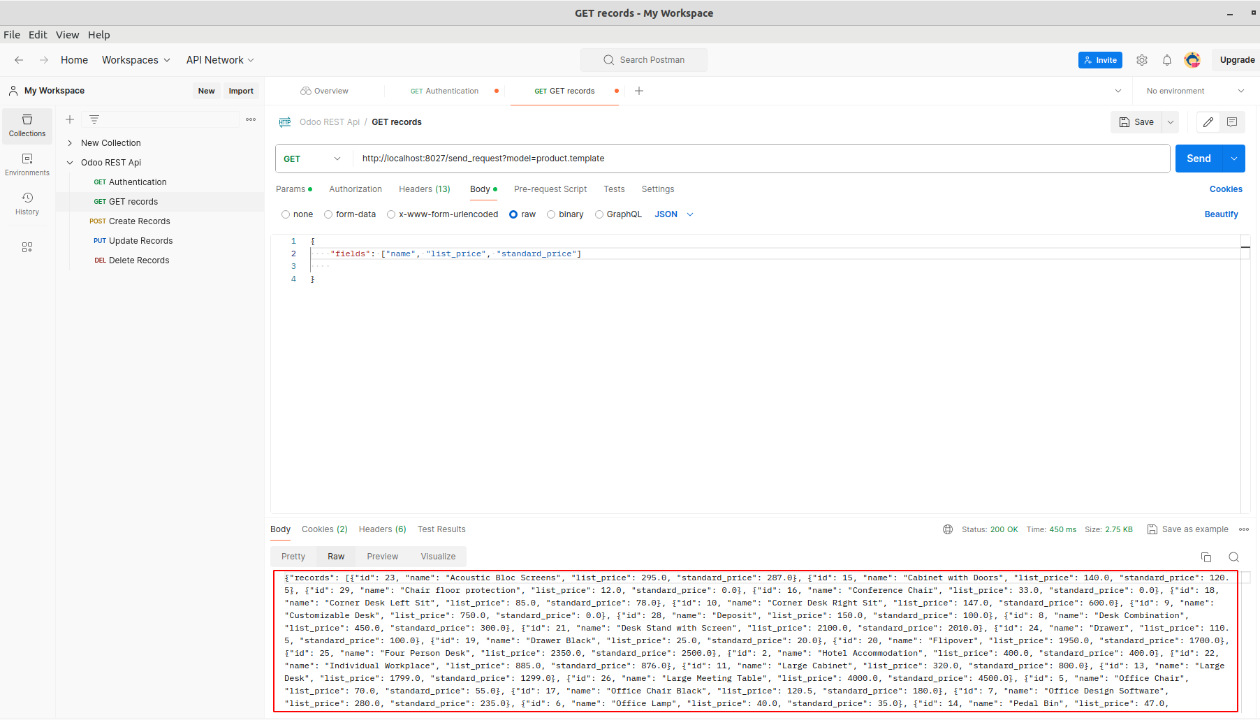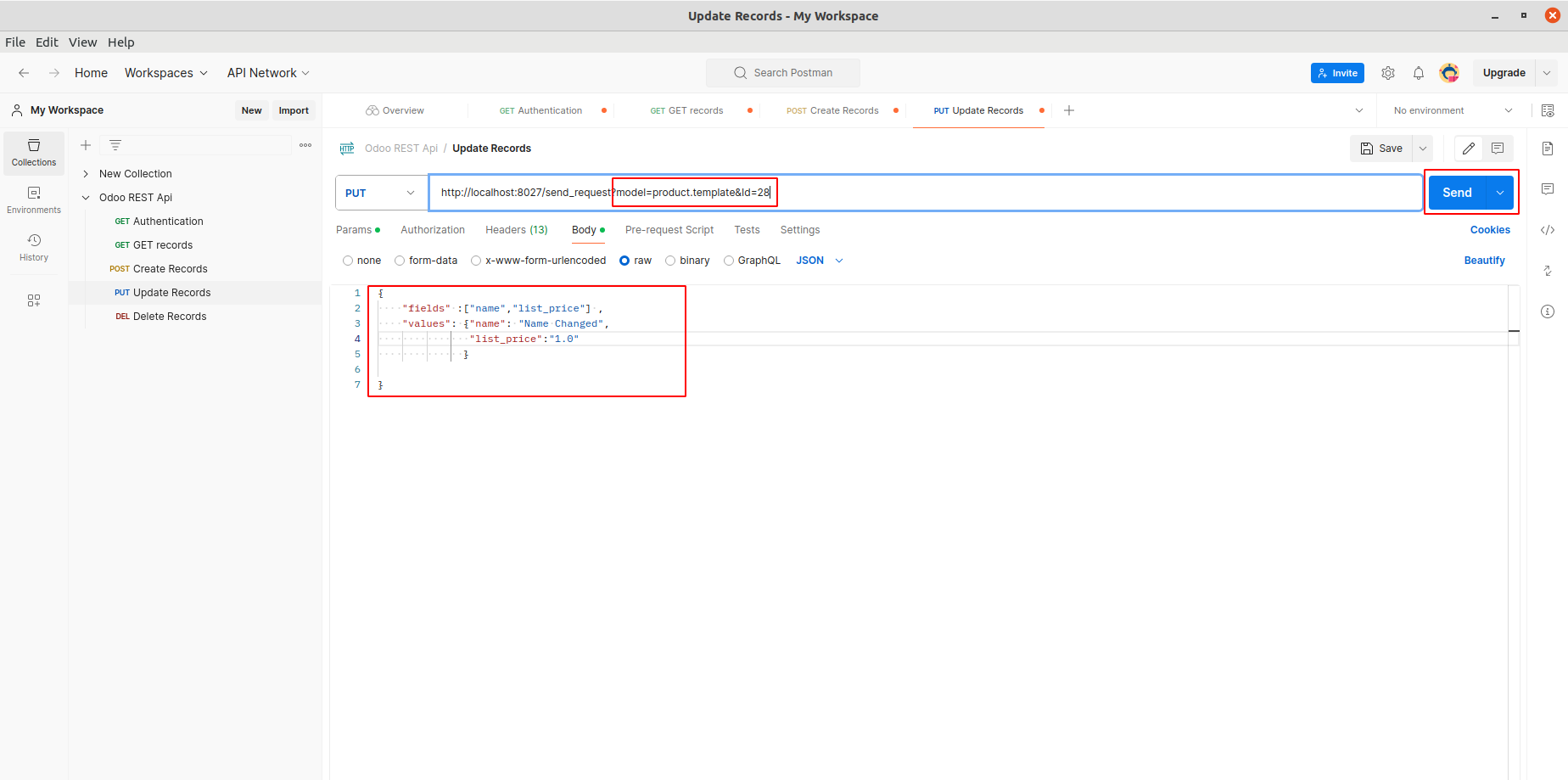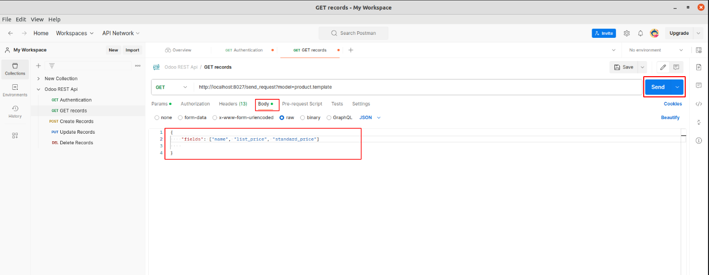 To retrieve a specific record, pass the ID in the URL (e.g., http://localhost:8027/send_request?model=product.template&Id=28) and click Send.