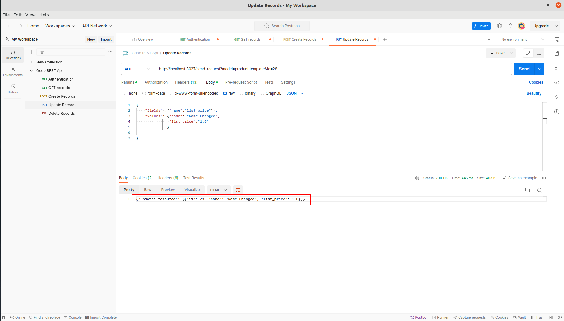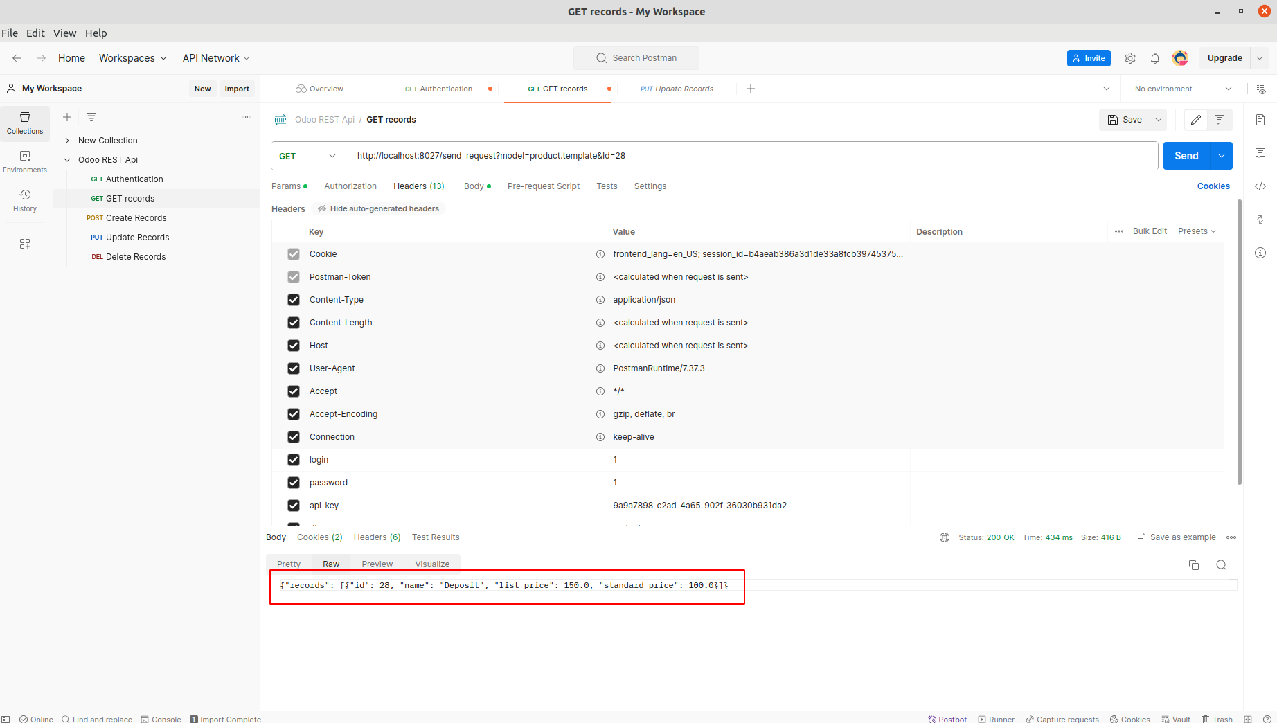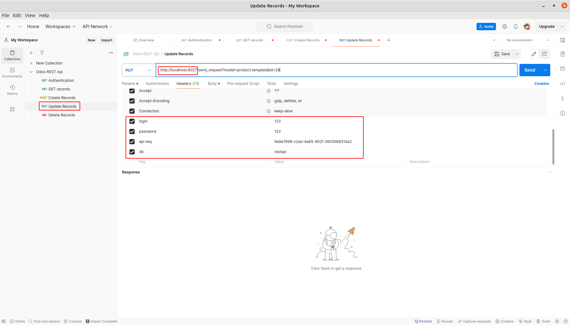 Open Update Records from Rest API Collection. Add db, api-key, login and password under Headers. Update the Base Url. Note: Make sure that PUT method is enabled for the selected model in Rest API record.