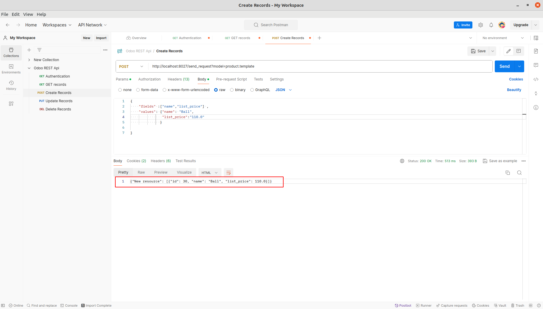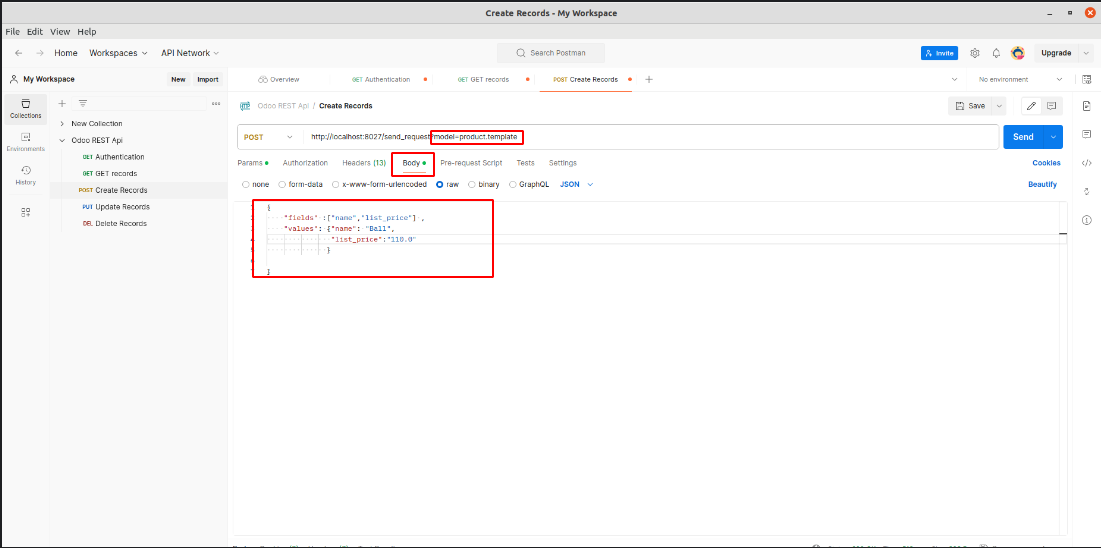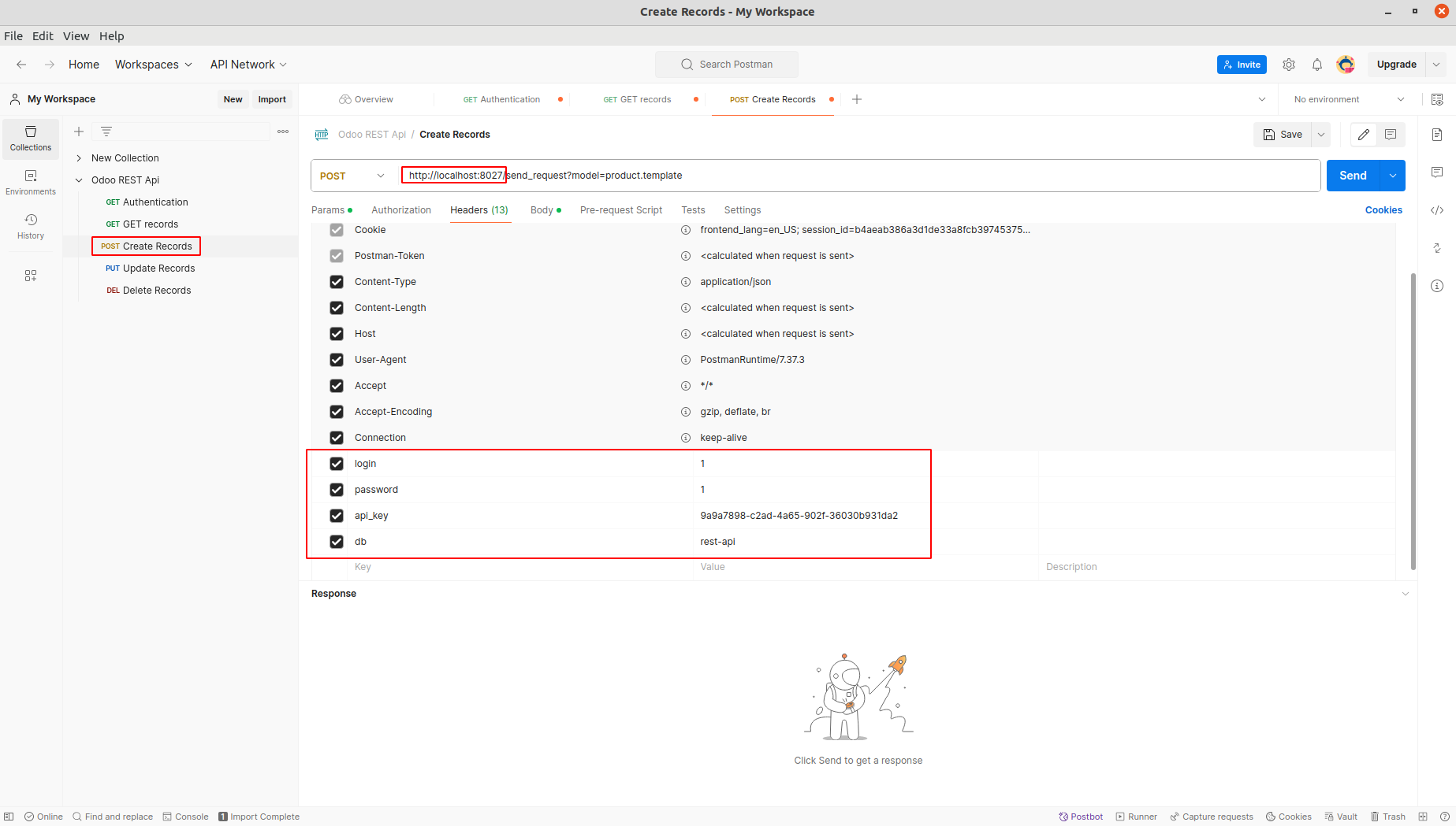 Open Create Records from Rest API Collection. Add db, api-key, login and password under Headers. Update the Base Url.