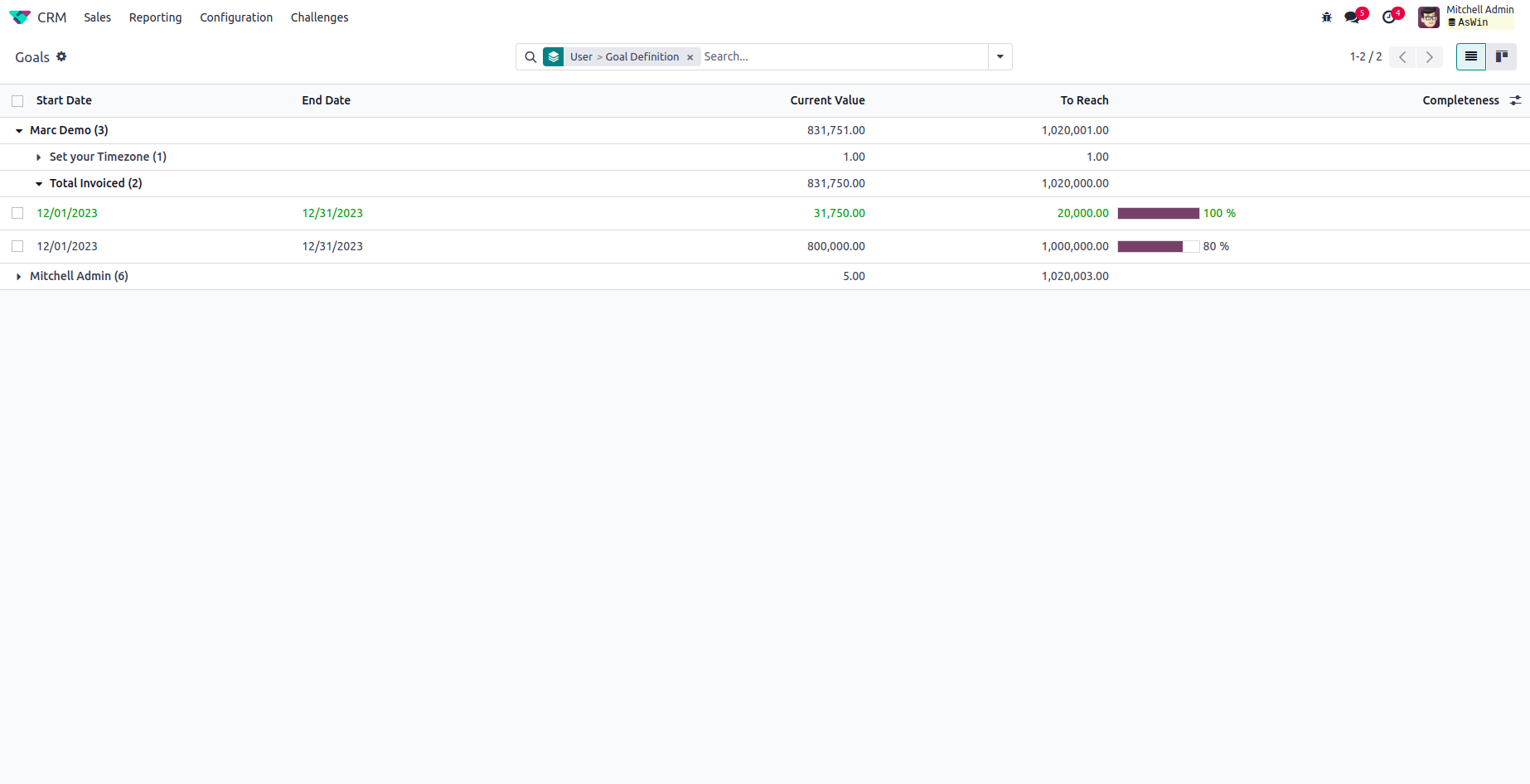 Go to CRM --> Challenges --> Goals and you can see the target set for the challenge and achievement made by each salesperson. Based on this target and achievement, incentive can be calculated for each salesperson.
