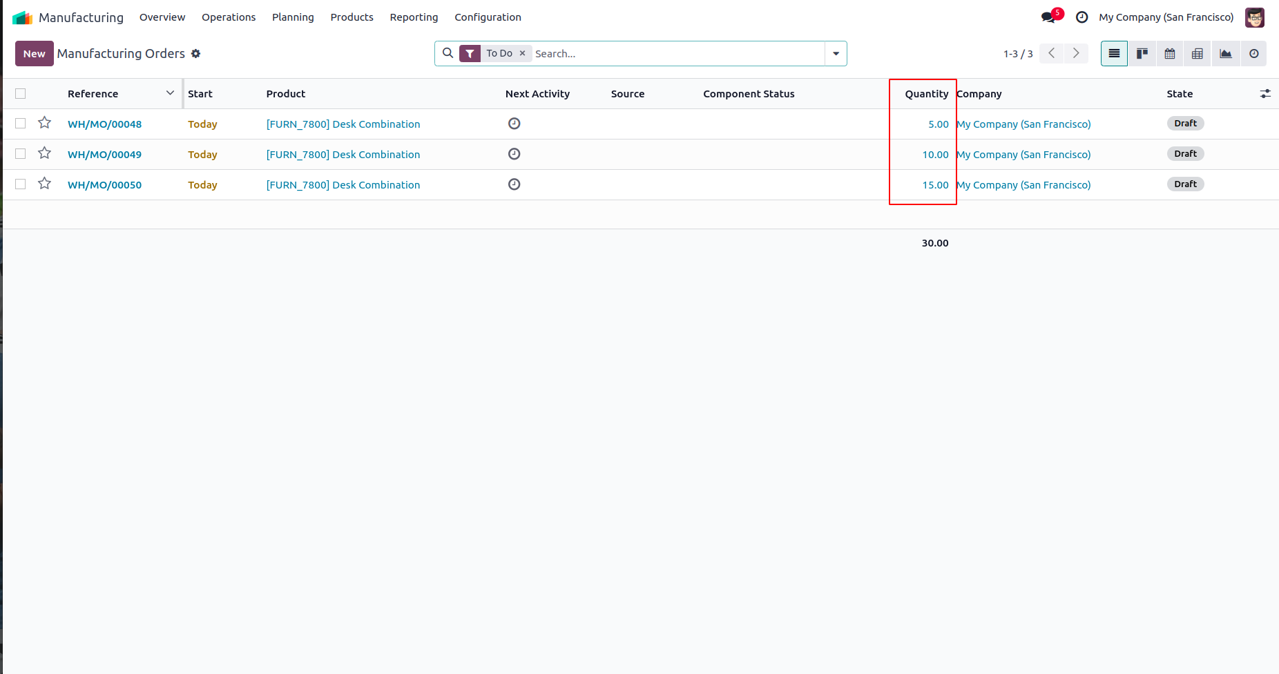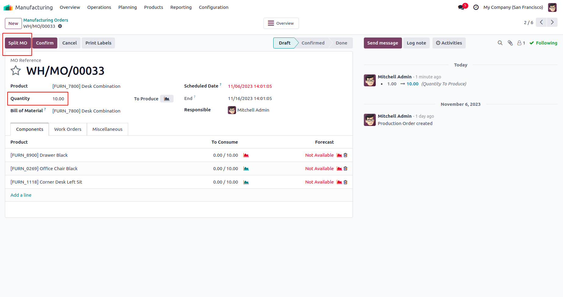 Go to Operations -> Manufacturing Orders ->We can see the button, split MO and total quantity.
