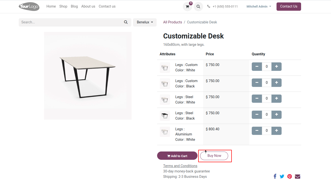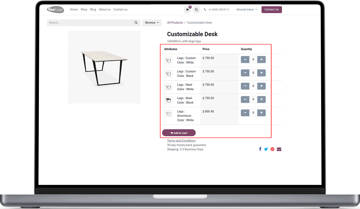 Product variants are displayed in a tabular format on the product page with a quantity field.