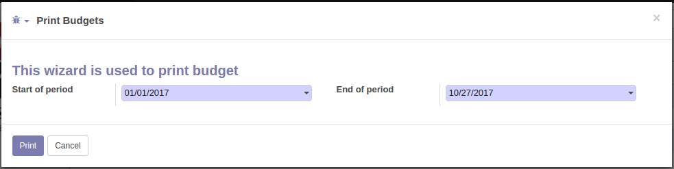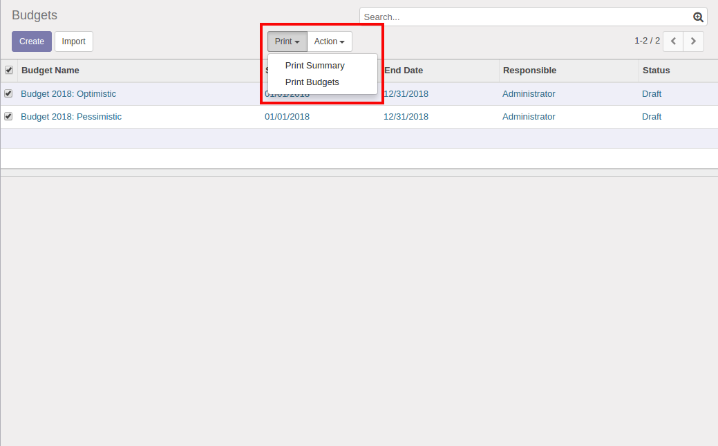 ☑ Option to print budget summary ☑ Option to print budgets ☑ Option to print budgets from analytic accounts ☑ Option to print budgets from budgetary positions