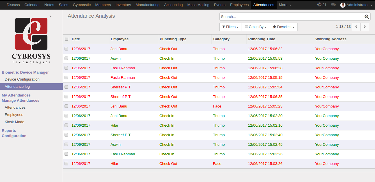 Here, Odoo automatically generates HR attendance log while downloading the device attendance.