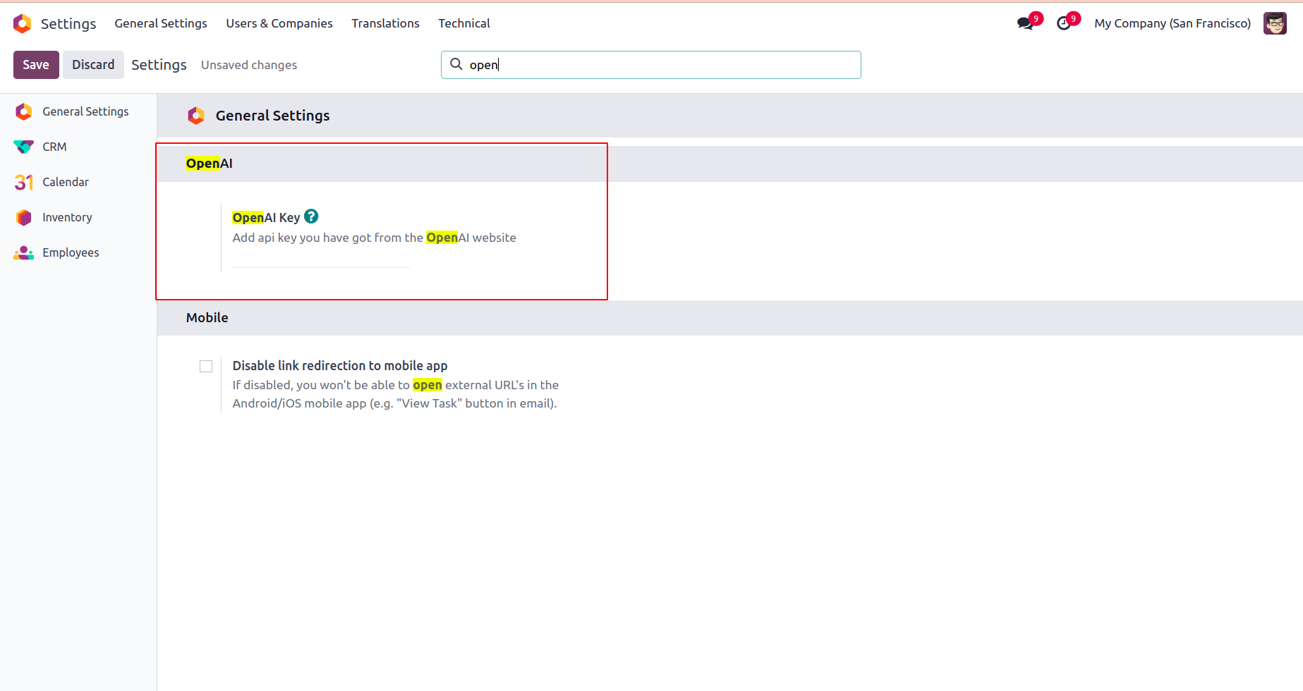 • This module helps to provide Open API key to Setting and use it in whole Odoo.