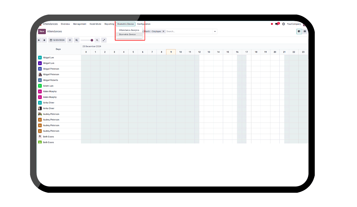 A new menu has been added to the Attendance Module for configuring the Biometric Device. You can find this option under Attendance --> Biometric Device.