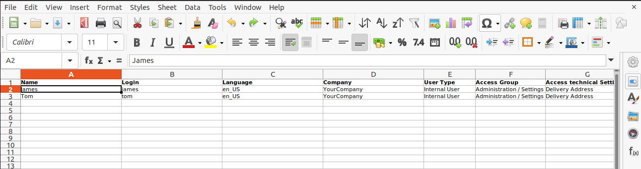 In default Odoo we need to configure users access rights after adding them into Odoo ERP system. This app allows to import users with UserName, Email ID, Language, User Type, Access Group, Access Technical Settings all these important fields.
