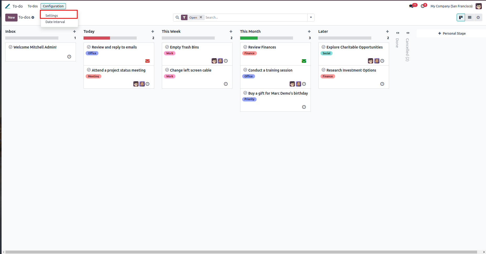 Under Color interval, create an interval of days: days from the current date to the deadline date. Lower limit and upper limit are used to create the interval.
