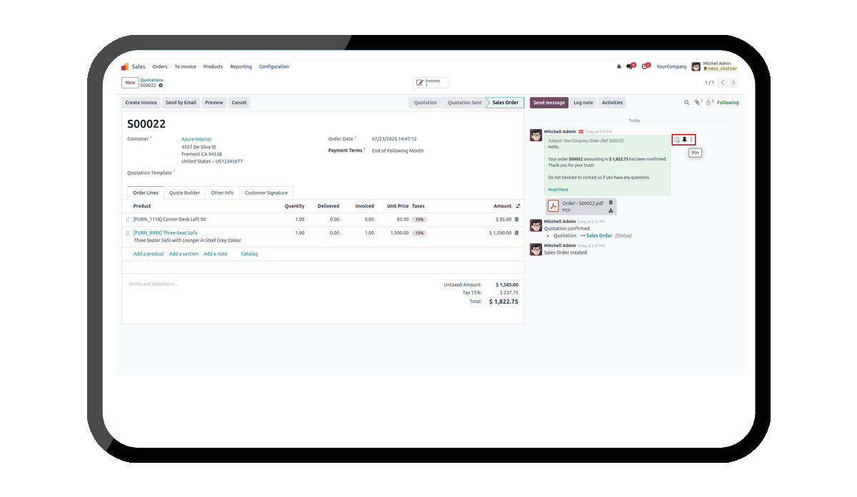 Click the pin icon next to a message or log note in the chatter. The message will be marked as pinned and stay easily accessible.
