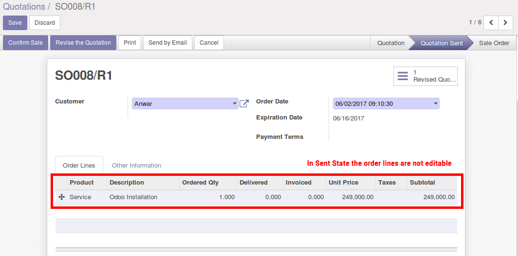 The clients will require negotiations whenever we sent a quotation to them.In such cases we need to edit the Quotation's order lines. We have included the 'Revise the Quotation' button for it. The order lines can be edited by a click on this button. At the same time a history or copy of the quotation will also be generated automatically.We can track the history using the smart buttons.