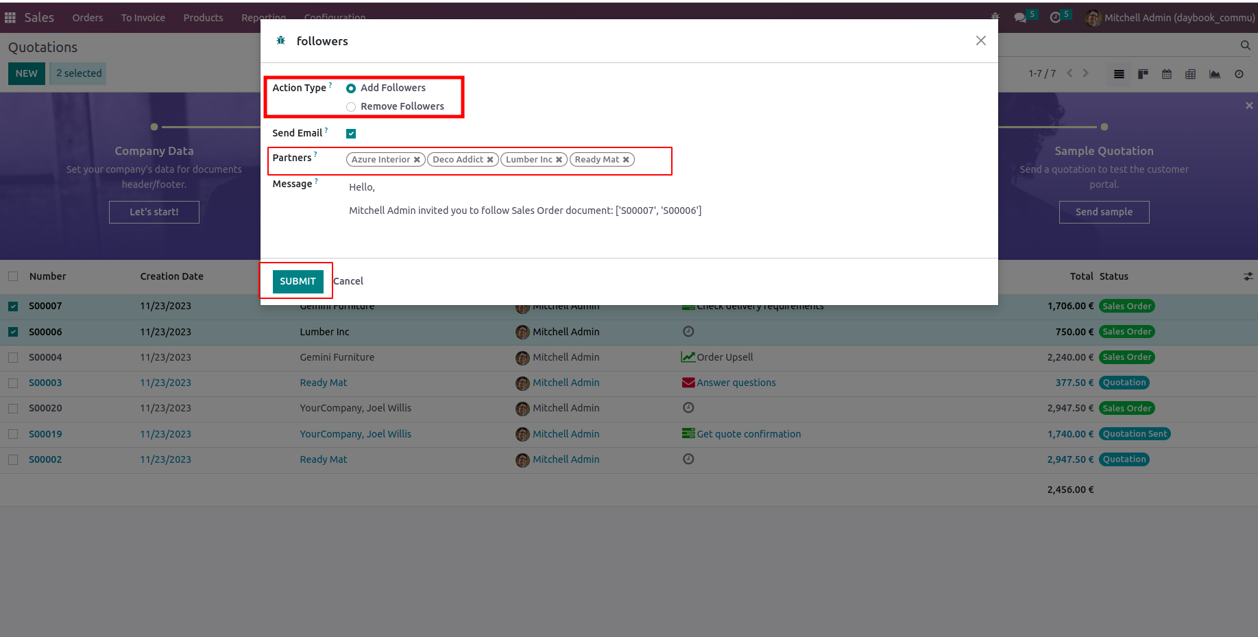 Then after one wizard opens, choose the action type, choose the Partner/Followers' Name whom you want to Add/Remove, then click the 'SUBMIT' button. Here we add Followers.