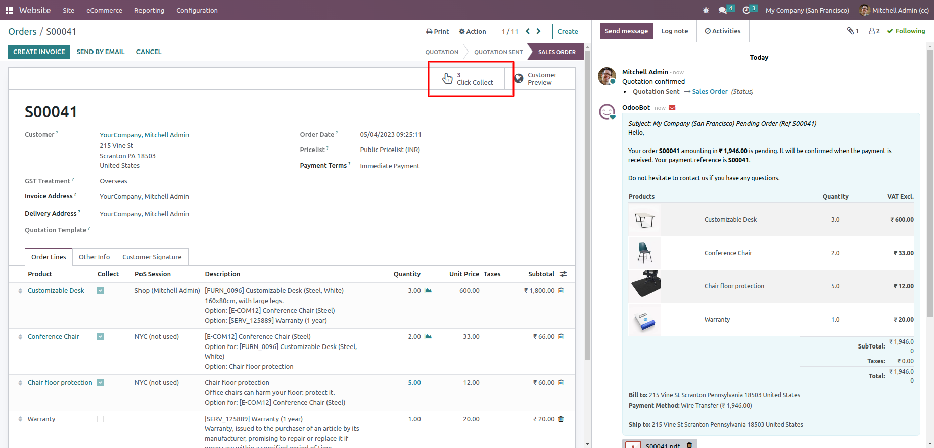 ->All click and collect products and the customer's selected pos session are visible in the sale order lines. The user may view all the click and collect products by clicking on the click collect smart tab.