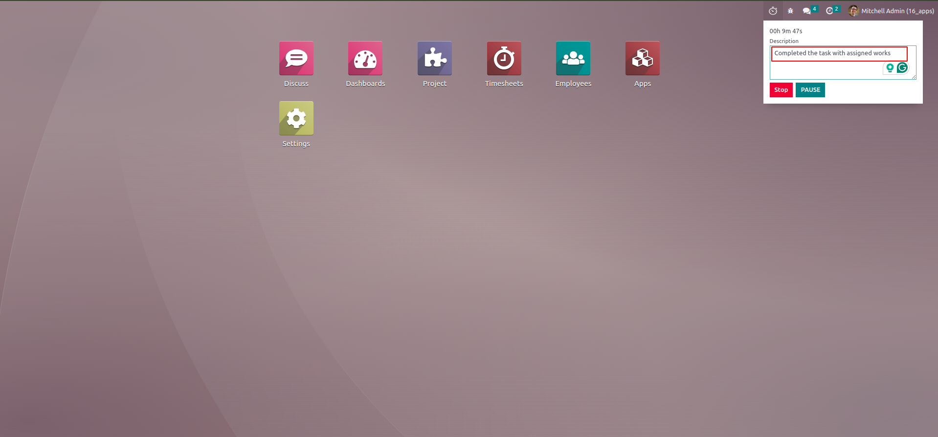 Timesheet will be created for selected project and task with given description