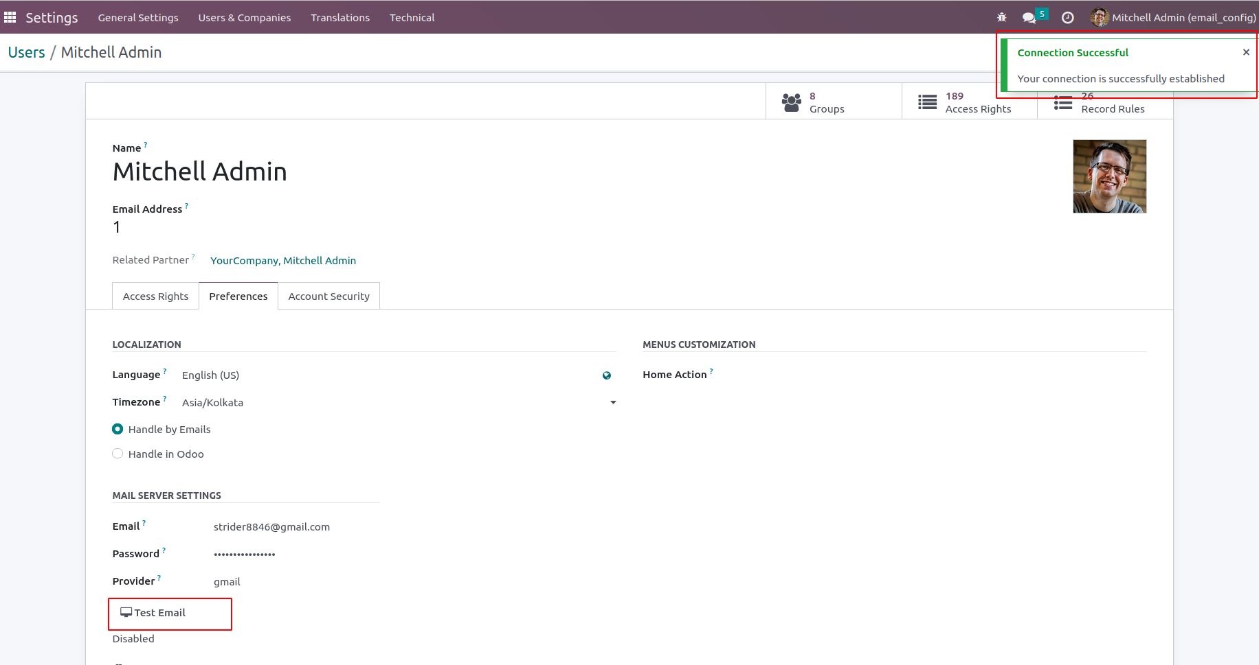 Upon clicking the Test Email button, a successful connection will be indicated by a sticky note.
