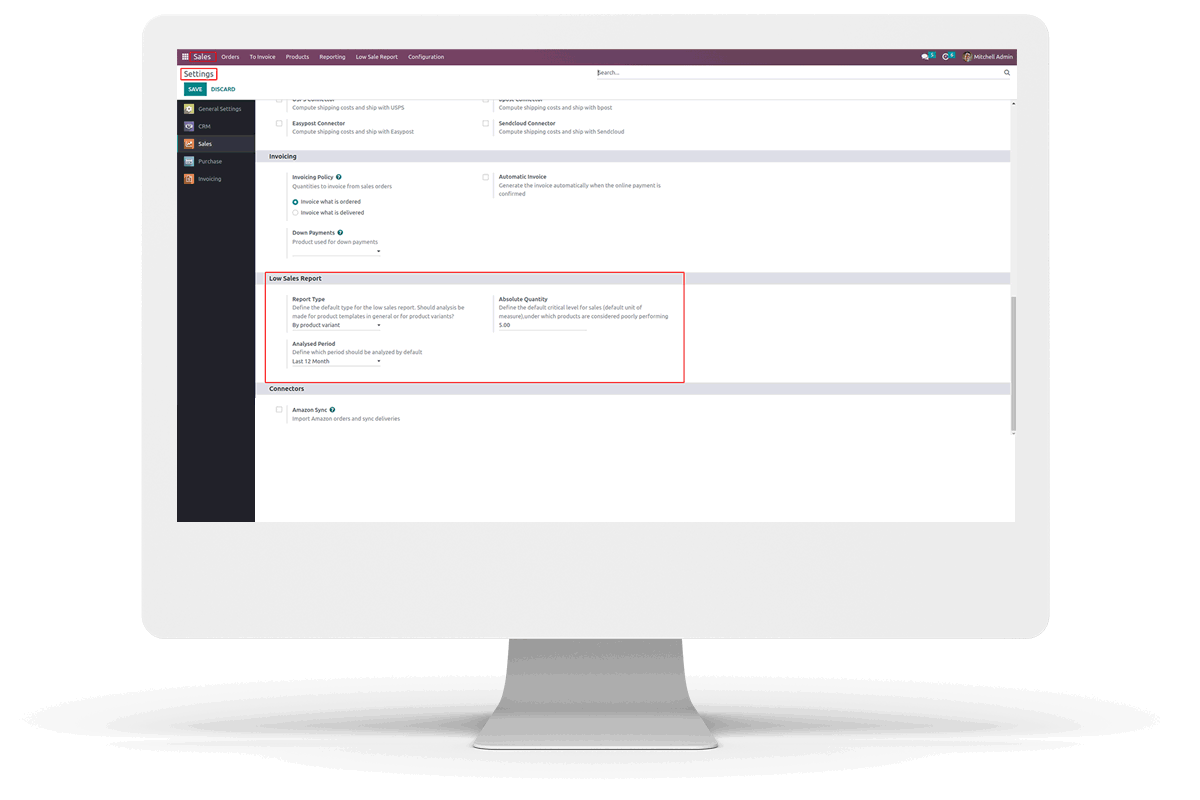 When install the module you can see the menu under the Sale 'Low Sale Report'