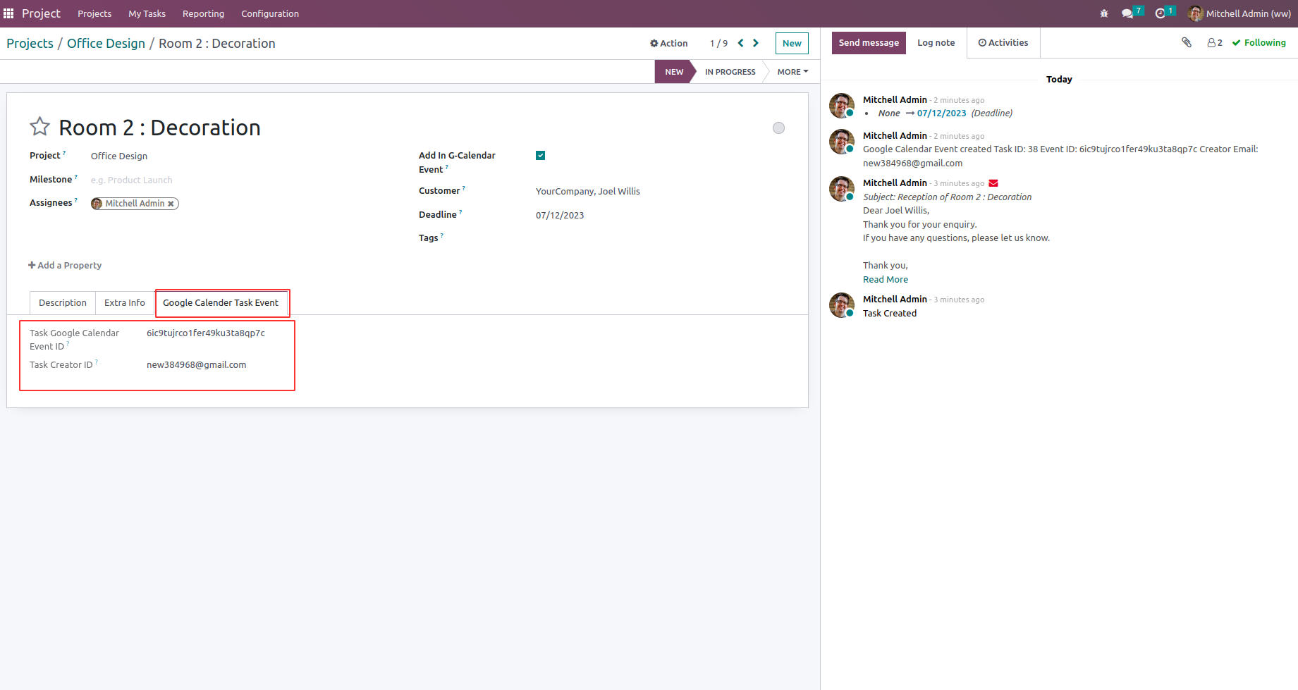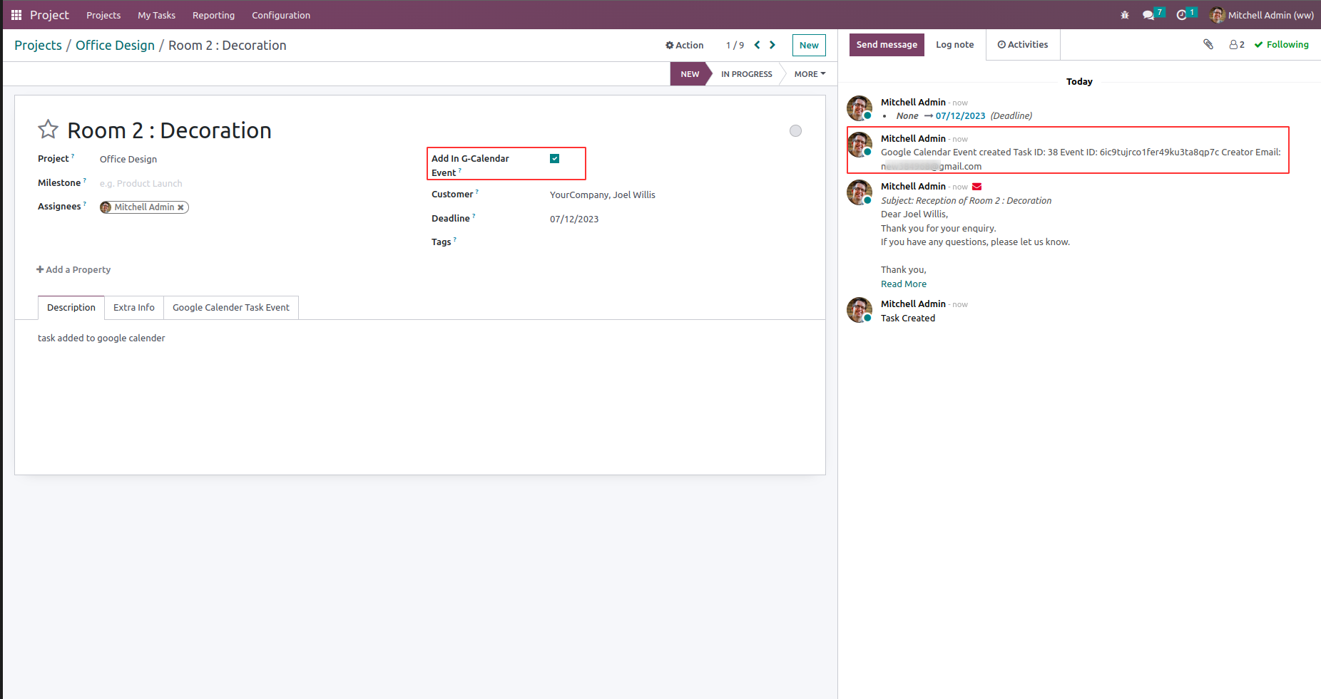 On updating project task like user, customer, name, description, deadline, due date etc., google calendar event also changed. also can see in chatter its status