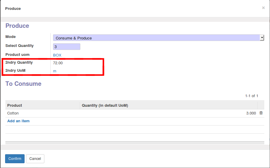 In production state, when we click on the 'Produce' button, The same window is appear with Secondary Quantity and UoM.