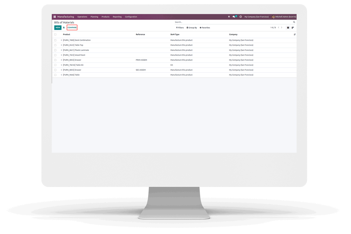 Go to Products -> Bill Of materials -> We can See The Compare button in Tree View