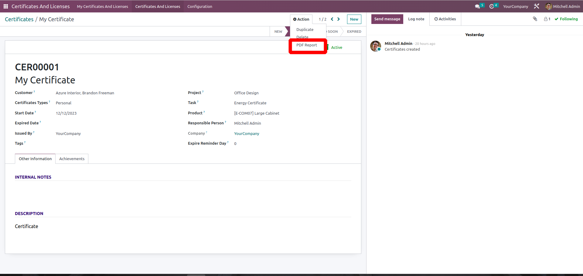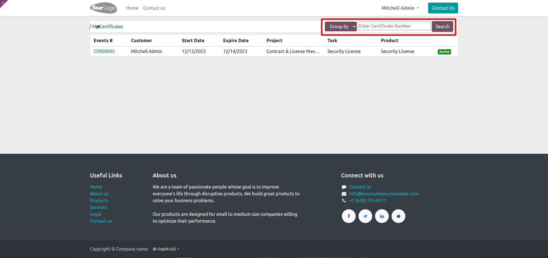 Certificate And License With Expiry Management Helps You To Manage Certificate And License Of Your Customers.You Can Manage All Certificate And License With Odoo.It Also Allows You To Manage Expiry Dates And Notifications