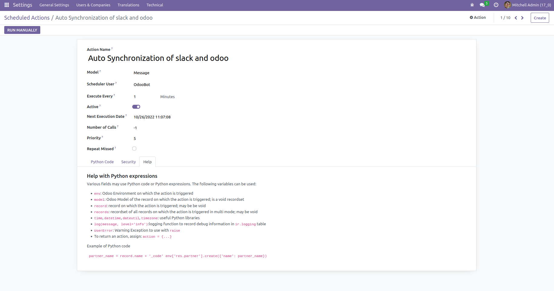 Here we uses a scheduled action to Synchronize communication between slack and odoo.
