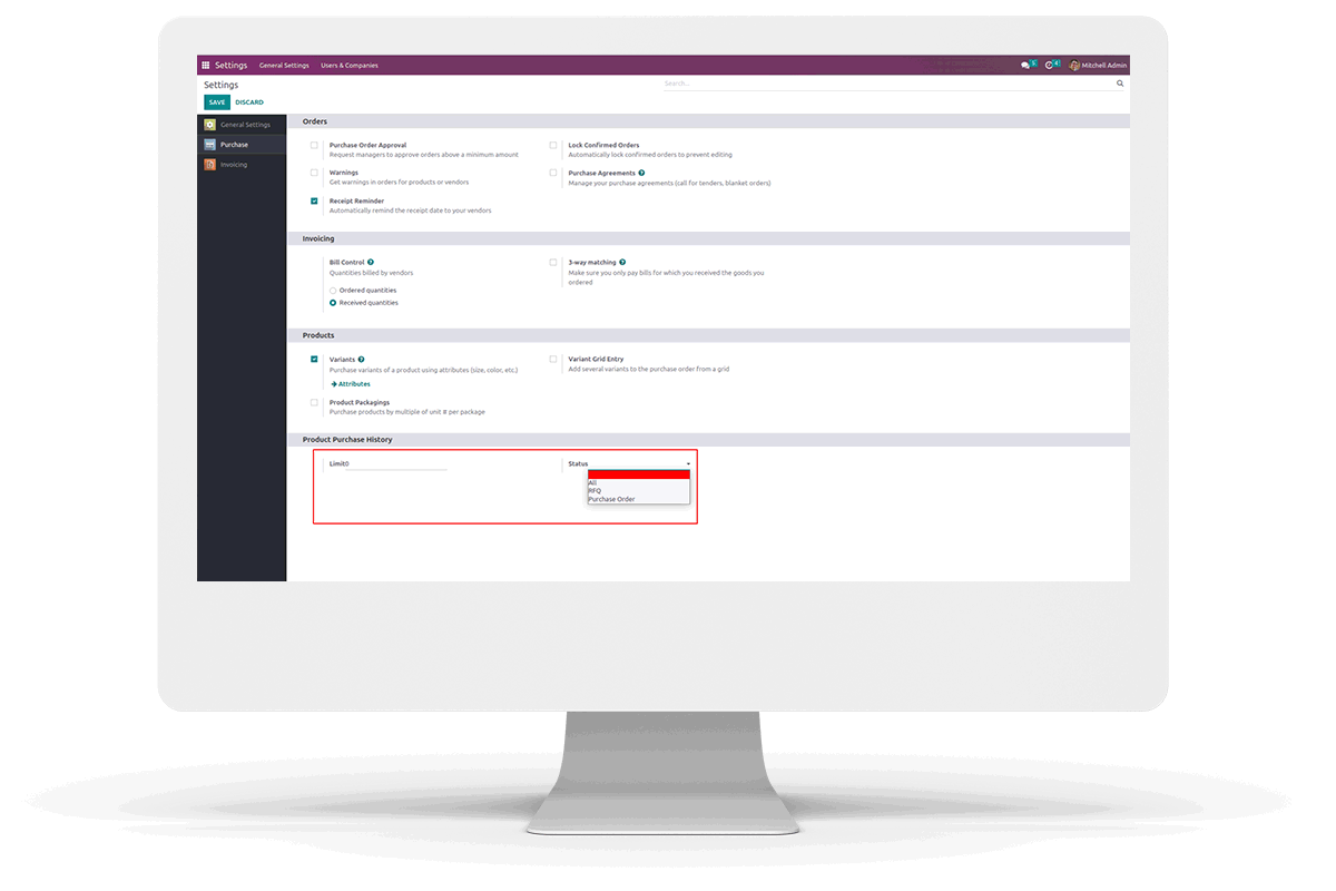 Set Limit and Status[All, RFQ, and Purchase Order] for purchase history