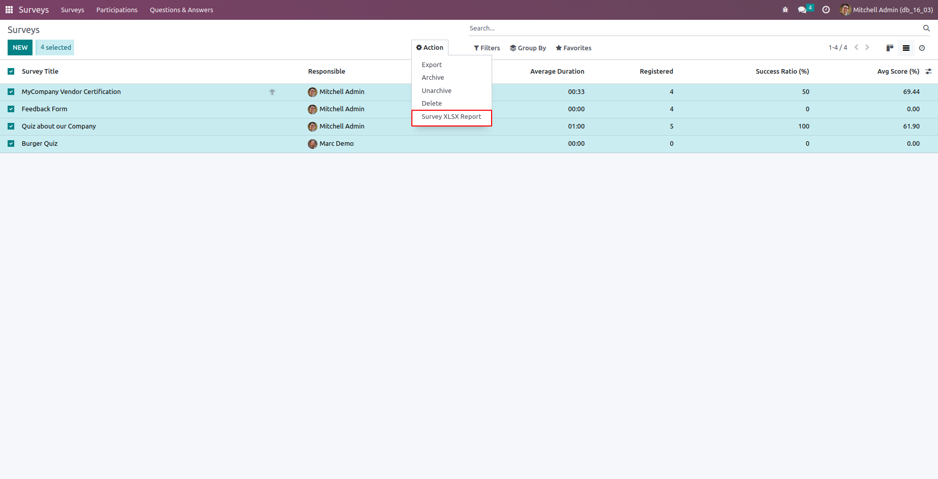 This Module helps to Export Survey Answers in XLSX Format. You can easily get the Questions and Answers of the Corresponding User