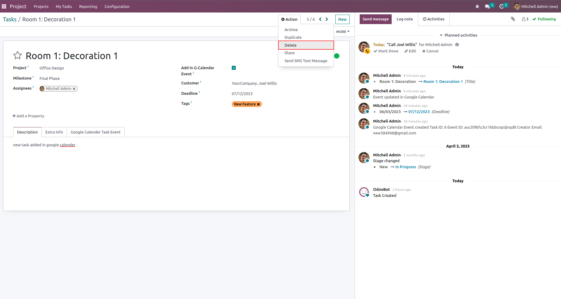 If user delete project task, then google calender also get deleted.