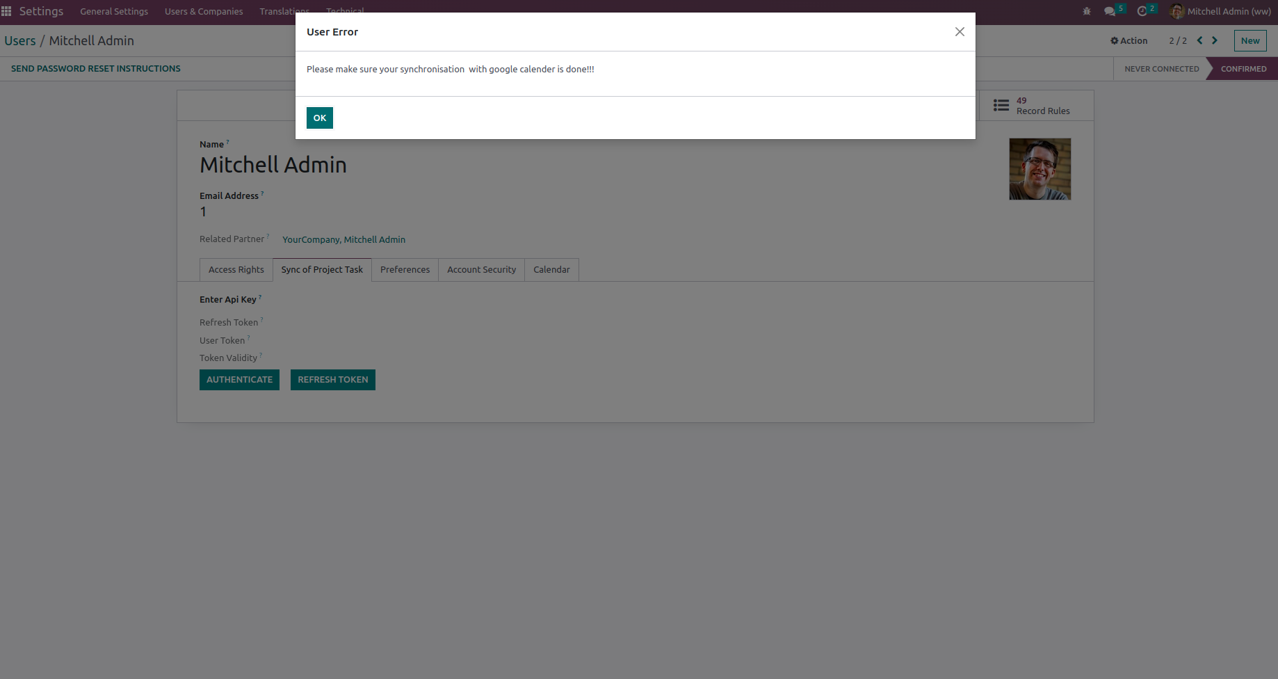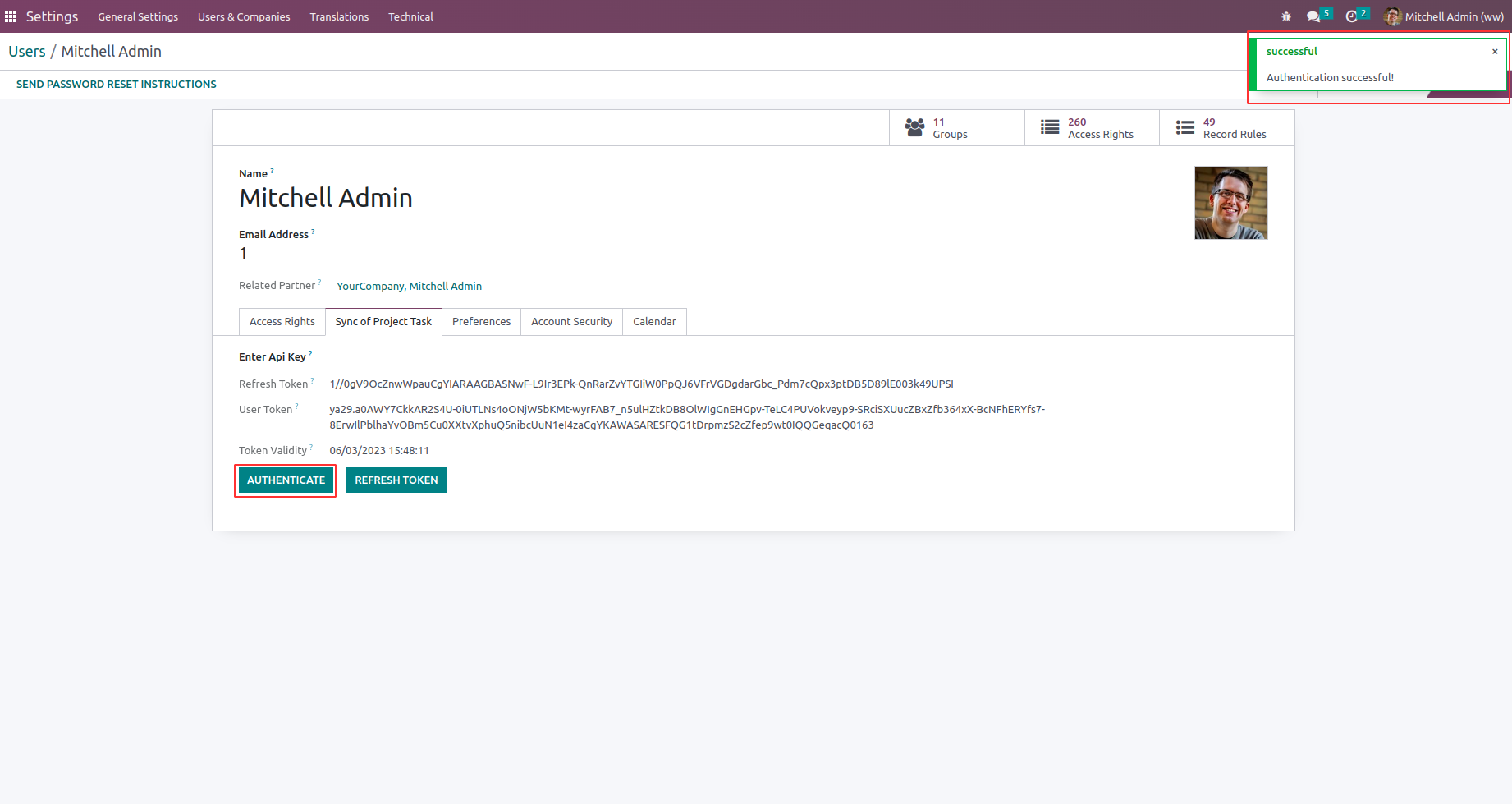 Under Settings > Users and Companies > Users menu under "Sync of Project Task" tab user need to click "AUTHENTICATE" button.