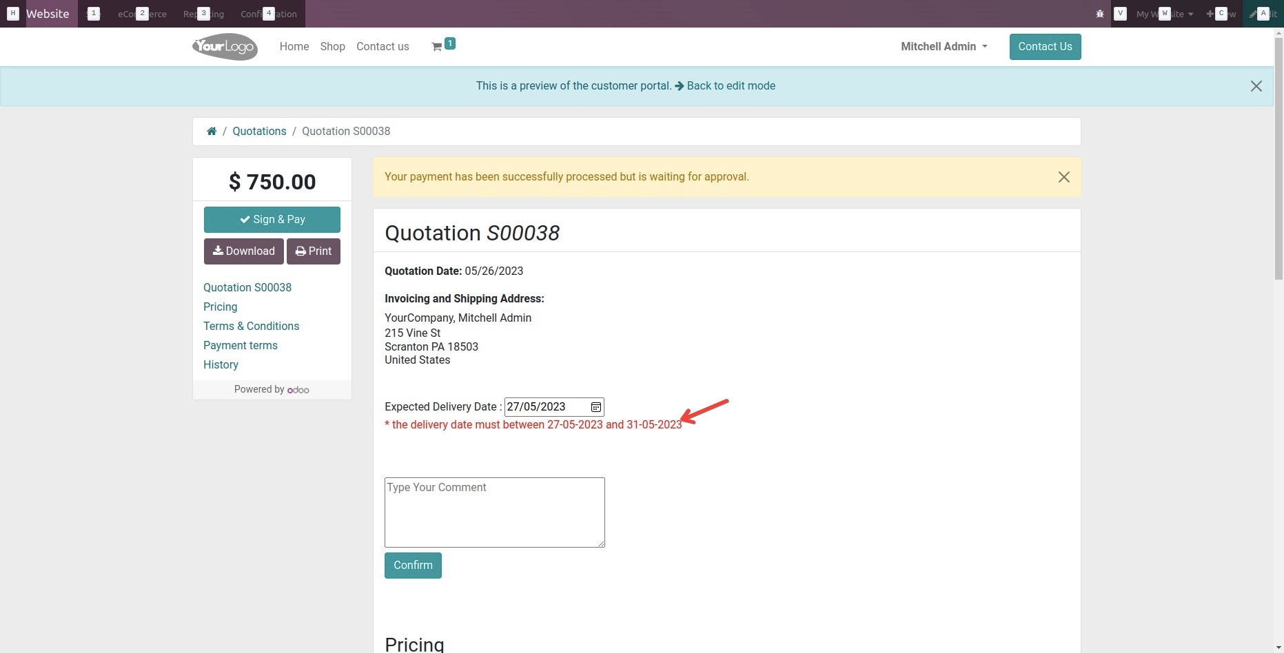 User can enter the delivery date and comments.