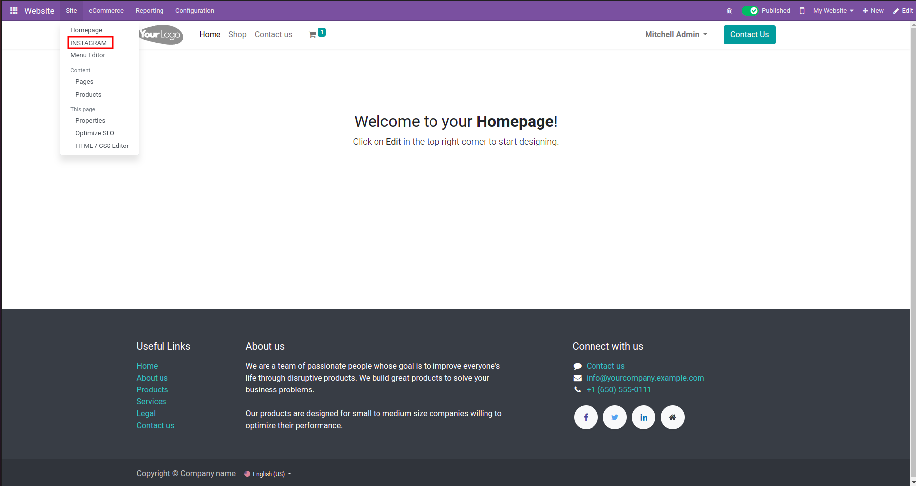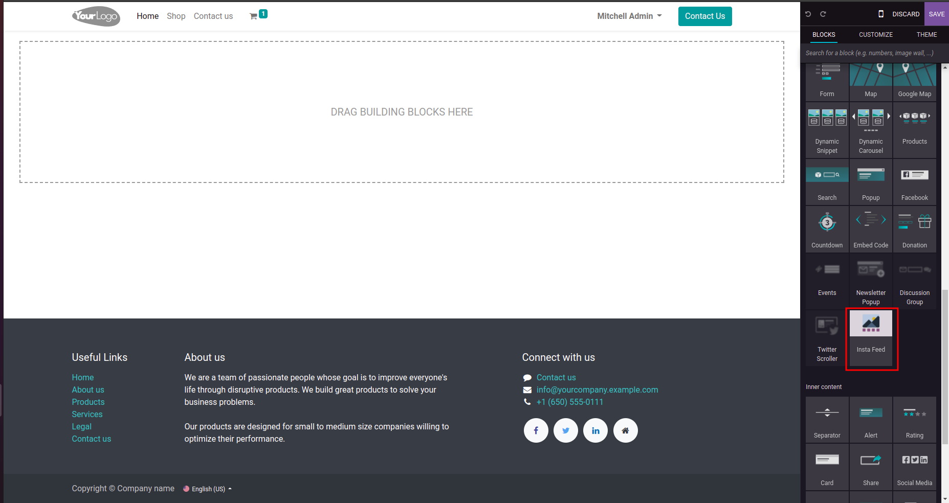 Visit the Odoo websitefrontend and click on the Edit option.After that, select the Instagram widget and drag it to the place where you want to showcase it on your Odoo website frontend, and click on the Save button.
