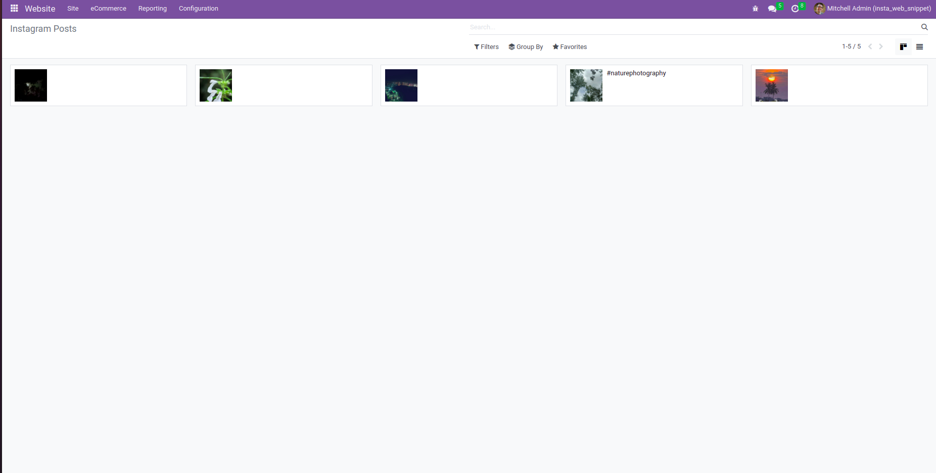 Once the installation is completed, visit the Odoo website app from the backend. Here, click on Configuration>>Instagram.You can set up your instagram profile by adding access key and click fetch account button.Once the profile is generated click the fetch post button to fetch instagram post into odoo